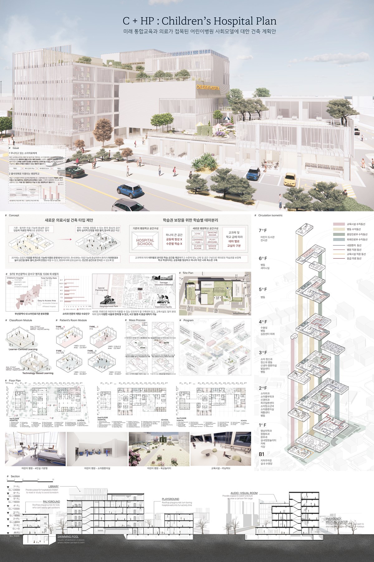 '사회적 현상에 대한 건축의 재해석'이라는 주제로 진행된 건축설계 프로젝트에서' C+HP'은 현재의 사회문제를 면밀히 분석하고 이에 대한 효과적인 해결책을 제시하였습니다. 전통적으로 기능 중심으로 설계된 병원을 어린이의 시각에서 재조명하여, 아이들에게 필요한 공간에 대한 건축적 상상과 분석적 제안이 두드러진 프로젝트입니다. 이 계획안은 기존 병원 건축 유형과 환자 및 보호자의 특성을 철저히 파악하여 그에 맞는 공간과 면적을 설계했습니다. 특히 중증환자와 응급시설의 부족 문제를 해결하기 위한 새로운 의료 인프라를 제안하며, 다양한 분야별 의료 공간을 포함하고 있습니다.더욱이, 아이들에게 필수적인 교육시설을 포함하여 장기 입원하는 어린이들이 학습의 기회를 잃지 않도록 한 점은 매우 의미가 큽니다. 이는 단순한 지역 의료 공간을 넘어, 미래의 어린이 병원 발전에 있어 정책적 및 실질적으로 중요한 역할을 할 것으로 기대됩니다.