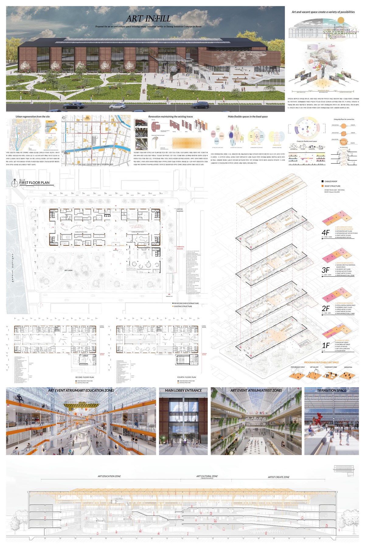 한승원 학생의 Art in:fill 프로젝트는 부산 사상공업단지의 유휴산업시설을 활용한 예술문화 복합공간을 제안하는 도시재생 및 건축 리모델링 과제다. 사상공업단지는 부산에서 가장 쇠퇴한 지역 중 하나로, 부산시와 지역 차원에서 다양한 재생 시도가 이루어지고 있다. 한승원 학생은 이 지역에 대한 심도 있는 조사를 바탕으로 폐공장을 사이트로 선정하고, 이를 예술문화 복합공간으로 재생해 단순 건물 재활용을 넘어서는 허브 공간으로 계획했다. 이 공간은 판매와 전시뿐 아니라 교육과 생산까지 아우르며 자족 기능을 갖춘 문화적 인큐베이터 역할을 할 수 있도록 설계되었다. 무엇을 남기고 어디에 증축할지에 대한 대안 검토 과정을 충실히 진행했으며, 대지의 공지는 공원이자 광장으로 활용하고 증축은 최소화했다. 기존 건물의 구조와 외벽 대부분을 보존하면서도 다양한 프로그램을 수용할 수 있는 공간을 제안한 것이 특징이다. 증축에 필요한 구조적 보강과 신·구 건물의 기술적 연결을 명확히 보여주며, 높은 완성도를 자랑하는 작품이라고 평가한다.