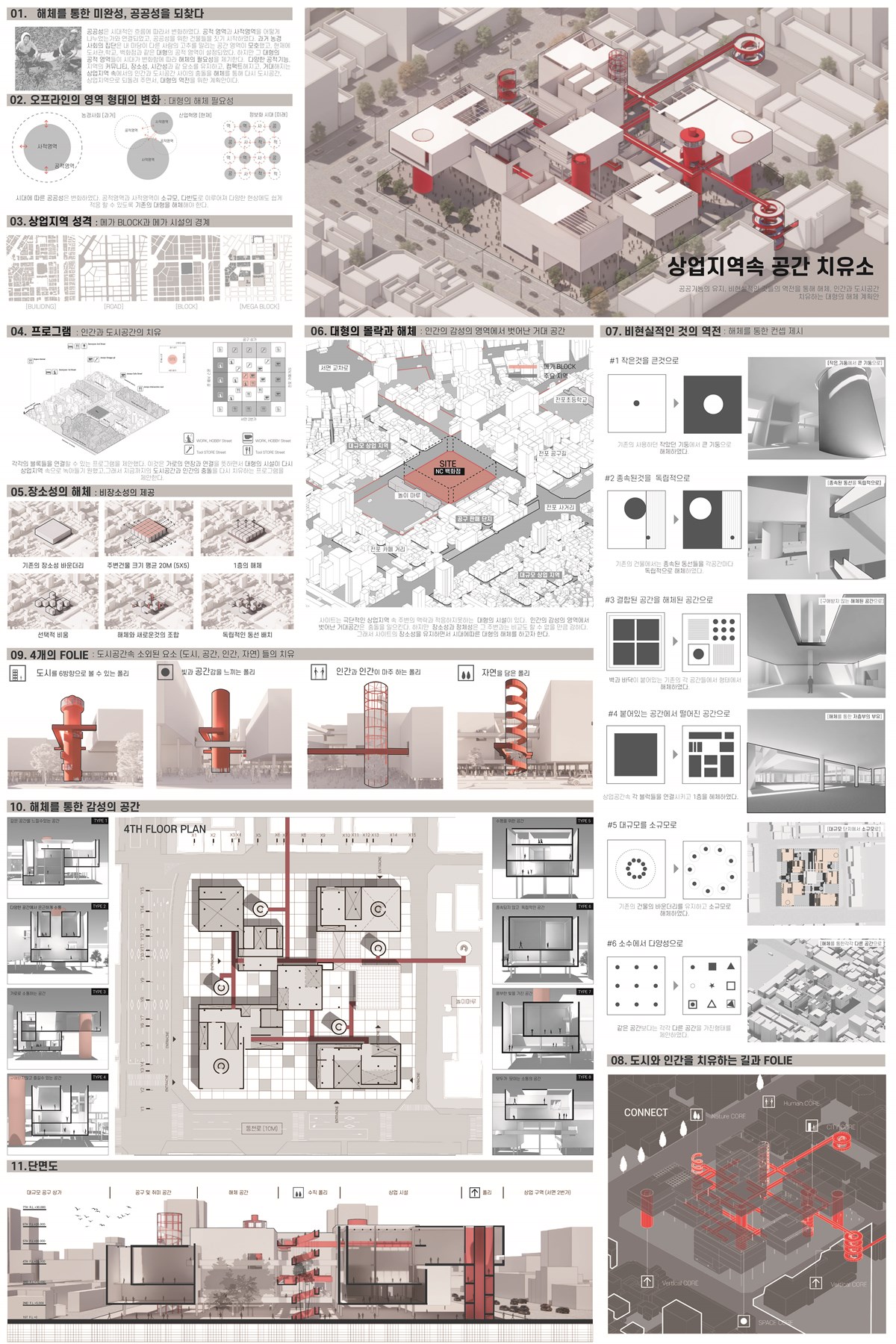 다양한 공적기능, 지역의 커뮤니티, 장소성, 시간성과 같은 요소를 유지하고, 컴팩트해지고, 거대해지는 상업지역 속에서의 인간과 도시공간 사이의 충돌을 해체를 통해 다시 도시공간, 상업지역으로 되돌려 주면서, 대형의 역전을 위한 계획안이다.