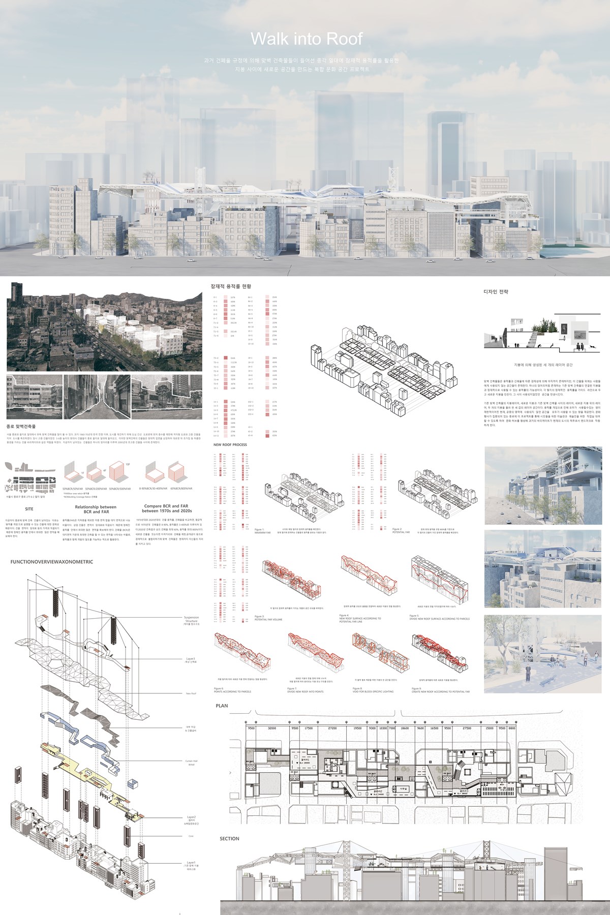 프로젝트는 서울 종로 일대의 노후된 맞벽 건축물의 잠재적 용적률을 활용해 공공문화공간을 제안한다. 맞벽 건축물과 골목을 그대로 유지하되, 지붕을 연결해 활용하겠다는 아이디어에서 출발하였고, 더 적극적인 건축적 개입으로 지붕 위 공중공간을 제안하며 복합적이고 풍부한 문제로 발전하였다.