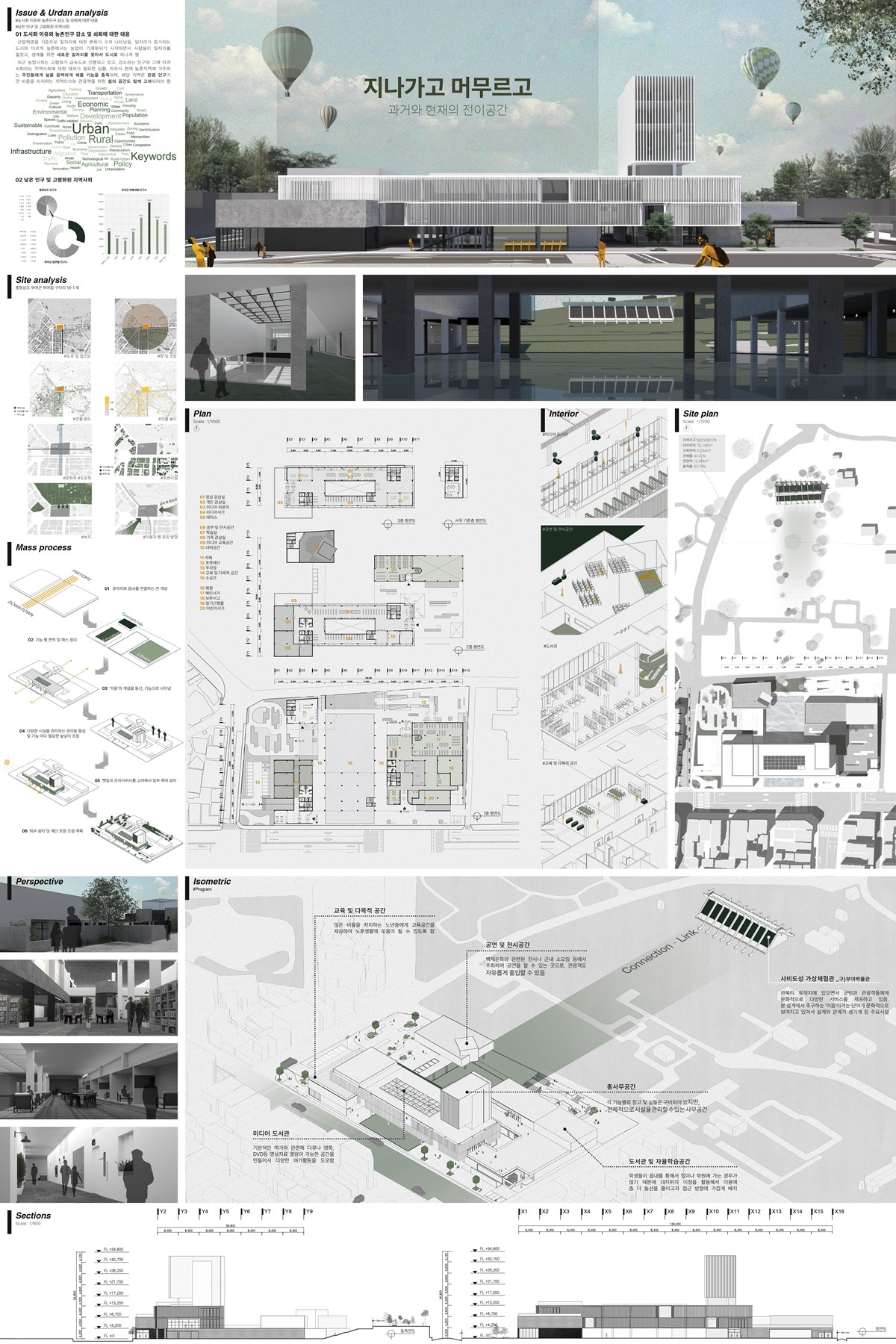 본 작품은 부여군에 거주하는 주민과 방문하는 여행객들을 위한 공간. 기억. 시간과의 만남을 제안하고 있다. 건물은 지역의 정서와 문화를 반영하여 새로운 정주형문화시설로서의 기능적 완성을 위해 미디어 도서관 및 공연시설을 중심으로, 일상적/비일상적 이용에 대응 가능한 프로그램으로. 구성된다. 대지를 기준으로 남쪽에는 읍내가, 북쪽에는 유적지가 위치하는데, 그 사이에서 강하면서도 부여 특유의 정적인 모습을 담을 수 있는 건축적인 표현으로 연결하고 있다. 길 건너 반대편에서 바라보는 넓은 수공간은 유적지의 모습을 자연스럽게 담고 있으며, 수공간 옆으로 이어지는 회랑은 과거와 현재를 이어주는 전이공간으로서의 역할을 기대할 수 있다.