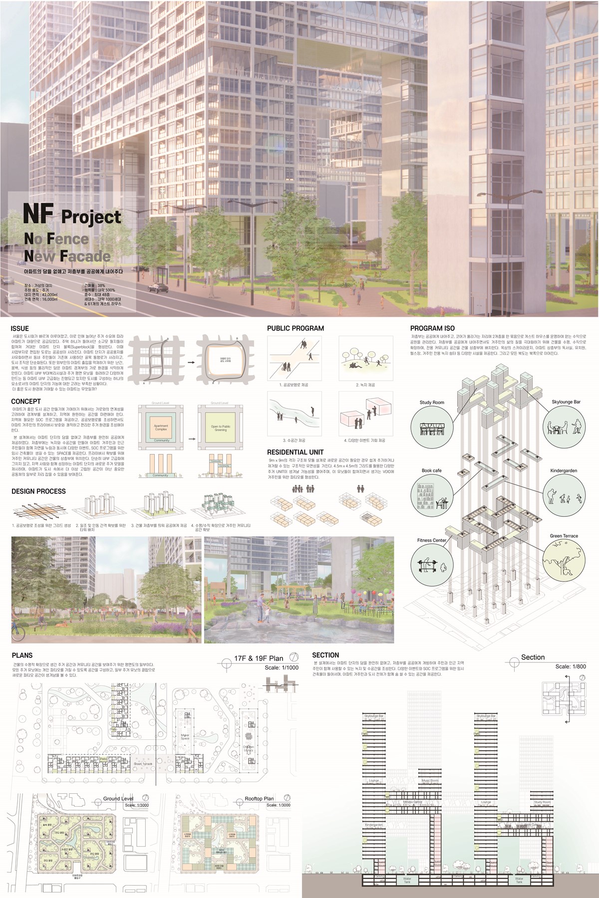 NF Project는 아파트 단지와 주변 도시 공동체 간의 관계를 재정립하는 혁신적인 시도이다. 아파트 단지의 경계를 허물고, 저층부를 지역 사회에 개방하여 도시와의 유기적인 연결을 강조하였으며, 다양한 SOC 프로그램과 공공 보행로, 녹지 및 수공간의 조성으로 아파트 단지가 도시 공동체의 중요한 요소로 기능하도록 유도하였다. 상층부에 위치한 거주민 전용 커뮤니티 시설은 단지 주민들의 생활 만족도를 높이면서도, 지상부의 열린 공간과 조화를 이루는 균형 잡힌 계획이다. 또한, 모듈식 구조를 통해 주거 유닛의 다양성과 유연성을 제공함으로써, 다양한 거주자의 요구를 반영하는 주거 모델을 제안한 것도 눈여겨볼만한 부분이다.