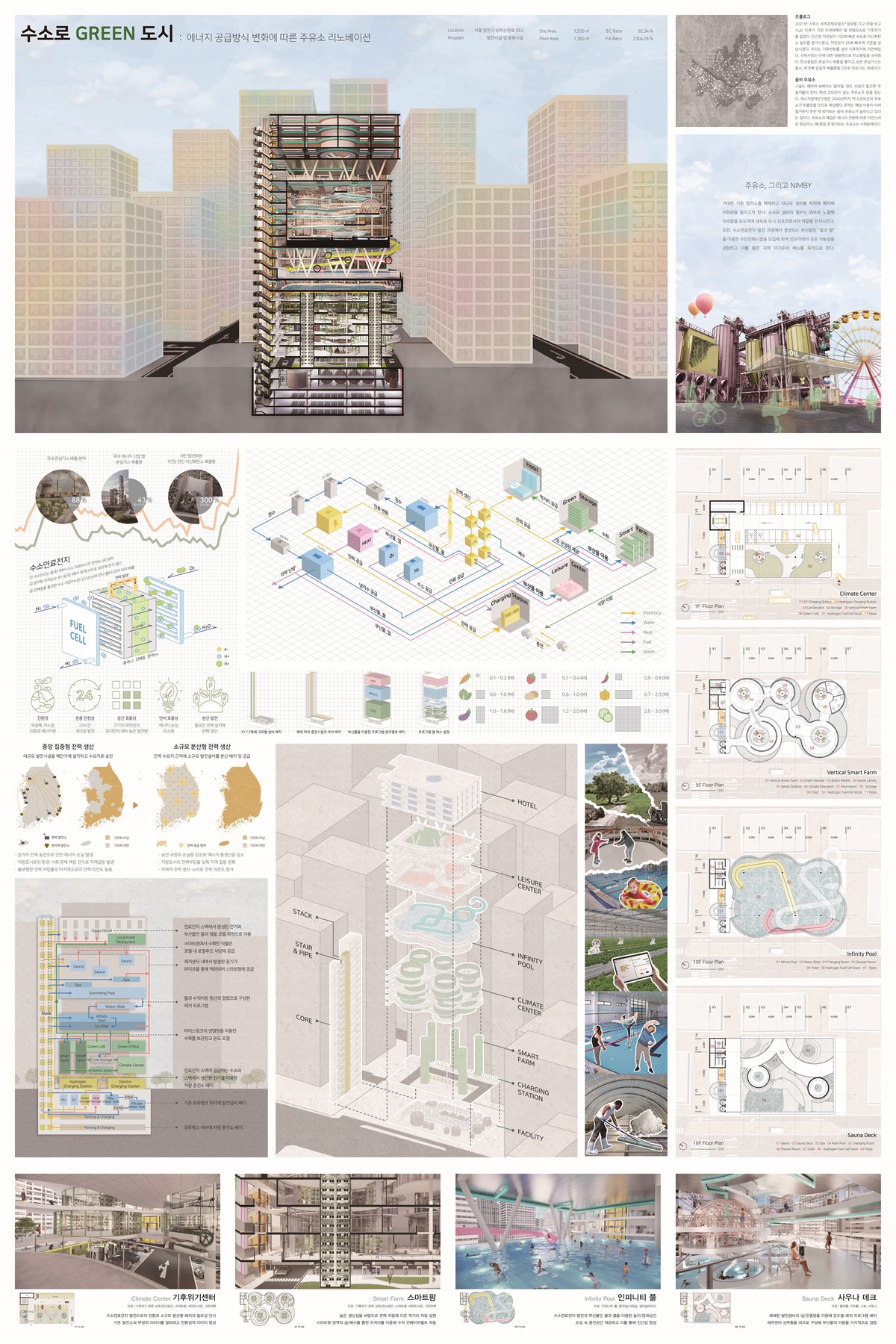 또한 발전과정에서 생성되는 부산물인 ‘물과 열’을 이용한 레저, 숙박, 교육·전시 등의 주민친화시설을 제공하고, 이를 지역별 니즈에 따라 다양한 형태로 변화할 수 있는 프로토타입을 제시하고자 한다. 이를 통해 탄소중립에 역행하던 주유소가 ‘소규모 분산형 수소연료전지 발전소’로의 재탄생함으로써 탄소중립시대에 발맞춰 변화해나가는 설계를 제안한다.