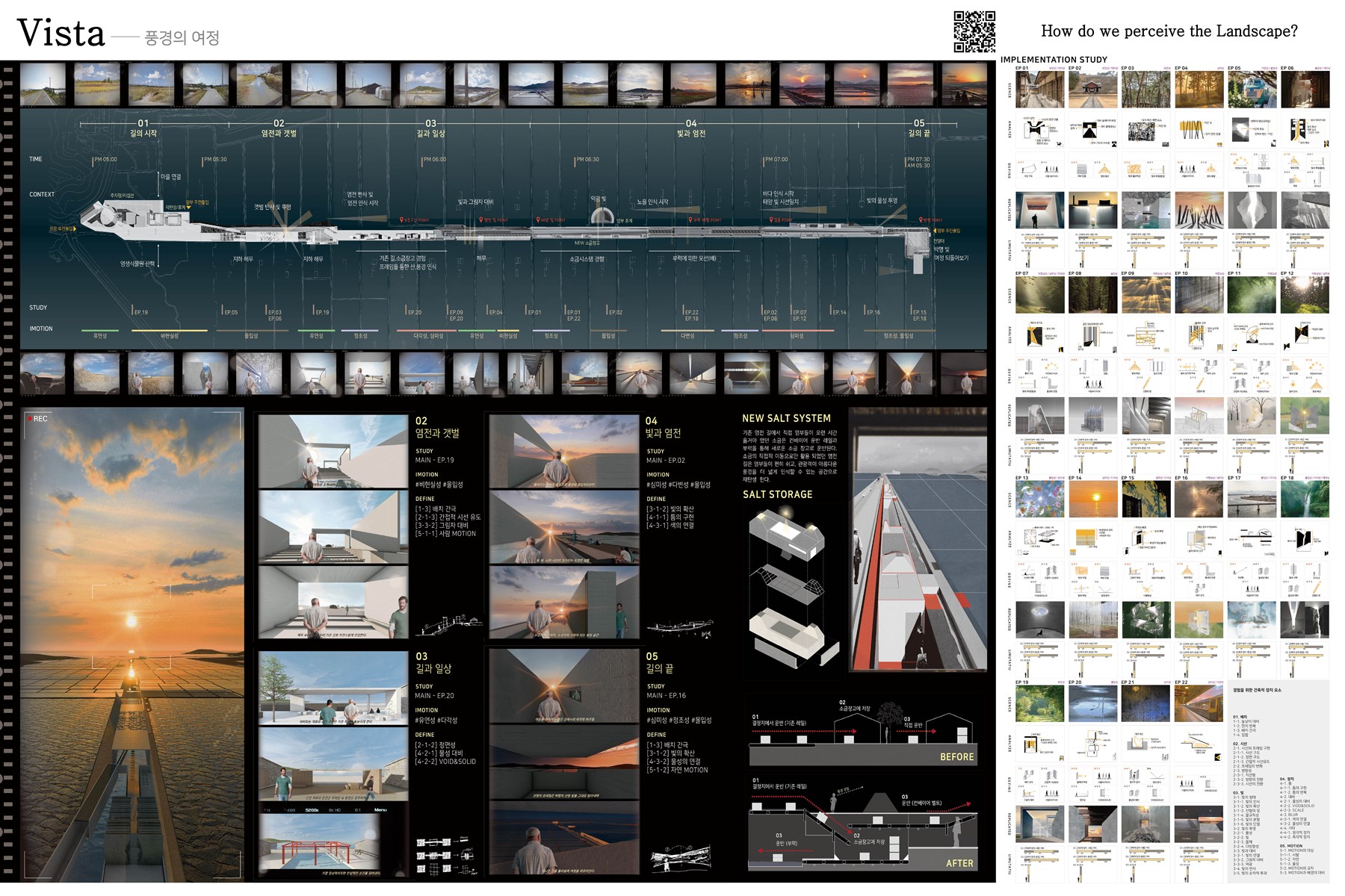 따라서 주변 풍경의 context에 기반하여 경험하는 '시선'에 집중해 시퀀스를 구성하였다. 염전 길은 하나의 방향성을 가지기 때문에 시간의 흐름에 따른 경험만이 온전히 이루어진다. 문화재로 등록되어있는 기존의 석조 소금창고를 보존하며, 보존하지 않는 소금창고의 경우 염부들의 편의를 위해 부력과 레일 시스템에 의한 새로운 소금 시스템으로써 재탄생하였다. 소금의 직접적 이동으로만 활용되었던 염전 길은 염부들이 편히 쉬고, 관광객이 각각의 레벨에서 빛, 물, 염부들과의 시선을 교류하며 풍경을 더 넓게 인식할 수 있는 기회를 만들어주며 지역의 새로운 마을이자 관광 자원이 될 것이다.