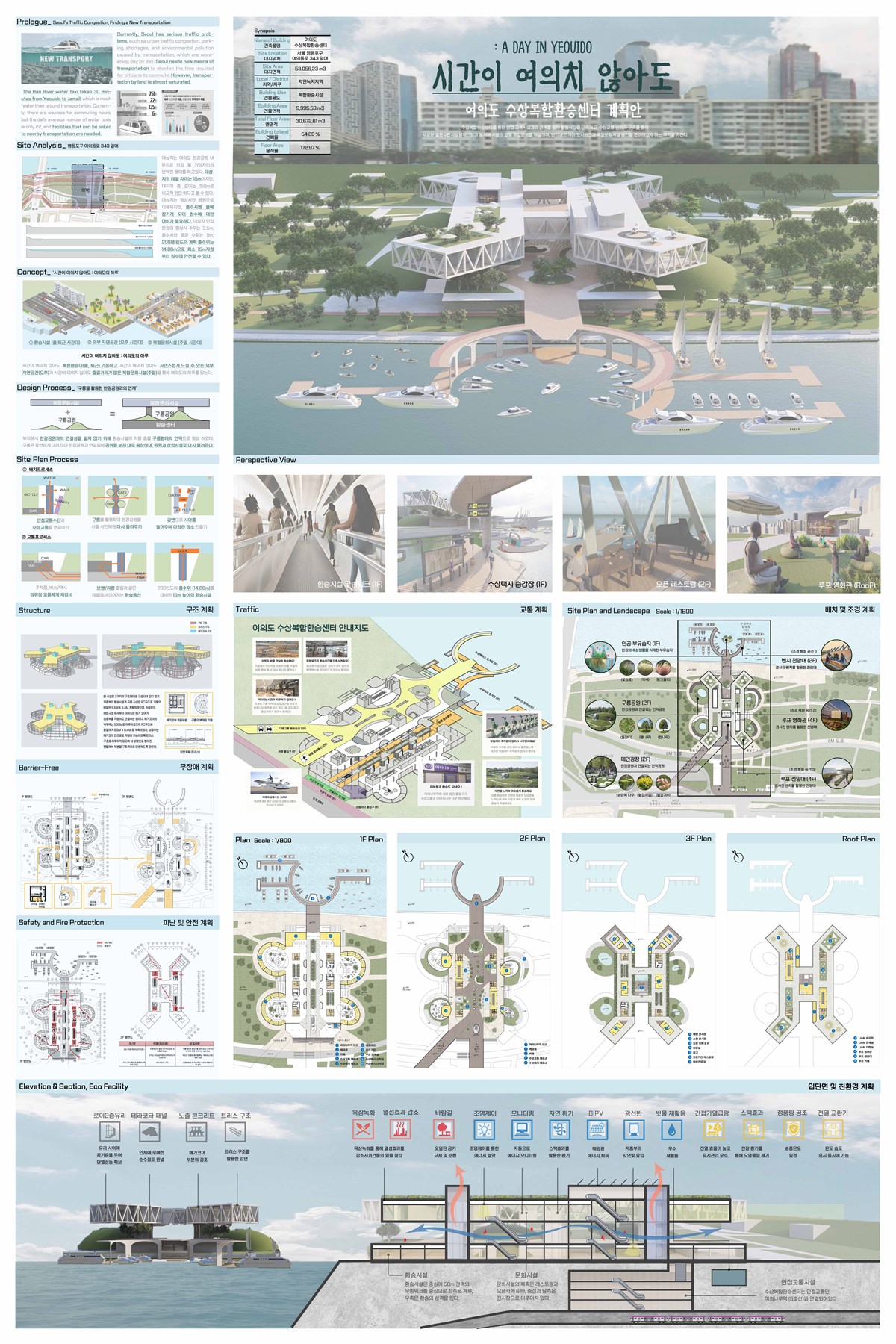 대지 상황에 따라 강변을 바라보는 형태의 환승시설을 저층부에 배치한 후, 침수에 대비하여 층고가 높아진 환승시설로 인해 기존의 여의도 한강공원이 수평적으로 단절되지 않도록 구릉이라는 요소를 적용하여 사람들이 구릉을 오르내리며 공원과의 단절감을 해소하고자 한다. 상층부에는 가장 유동인구가 많은 여의도 한강공원에서 다양한 놀거리와, 먹거리를 즐길 수 있도록 복합문화시설을 계획하고자 한다.
