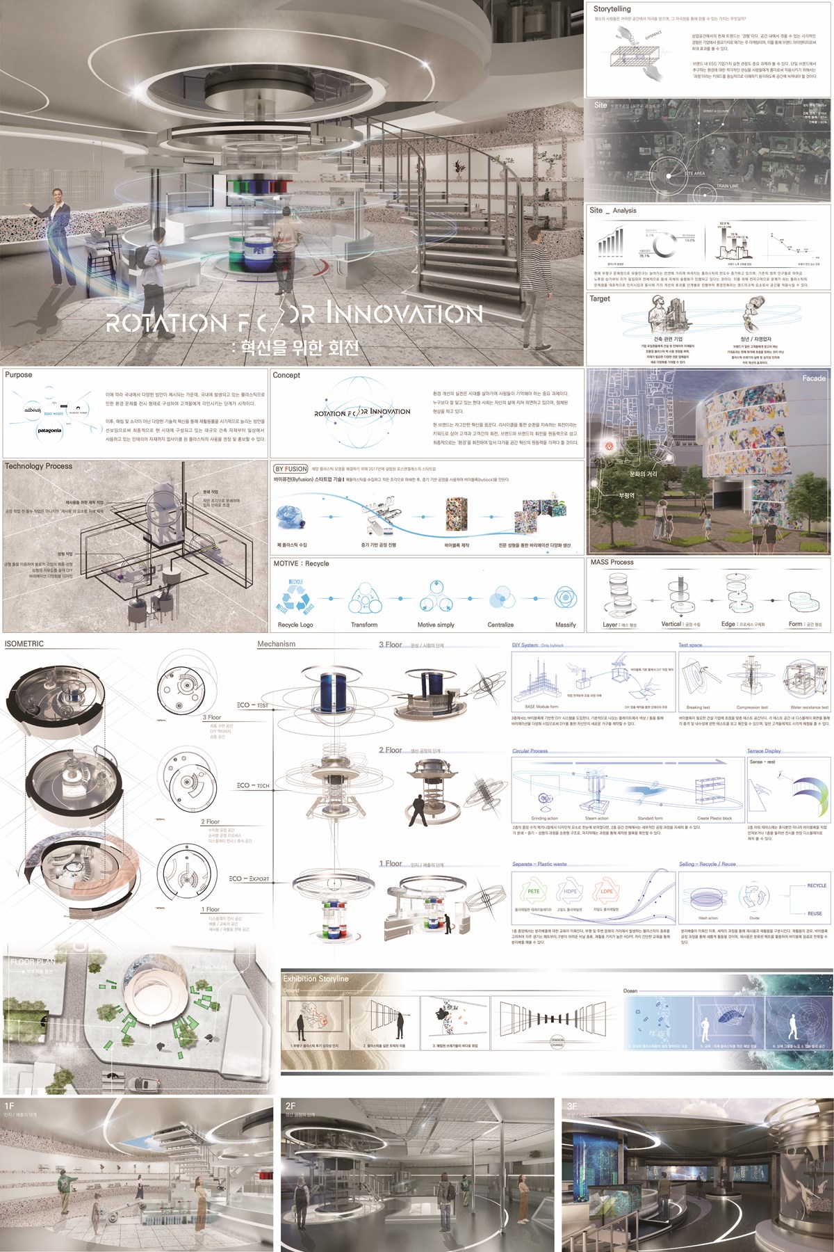 본 건축은 회전이라는 키워드를 통해 플라스틱이라는 현대 사회의 문제를 지적하며, 동시에 다양한 형태로 접근하여 지속적인 순환을 가능하게 하는 기술인 ‘바이 블록’을 홍보하고자 한다. 폐플라스틱을 자체적으로 수집하고, 파쇄하며, 증기 기반을 통한 재활용까지의 공정 과정을 거치는 바이퓨전의 스타트업 기술을 공간에 자연스럽게 녹여낸다면 플라스틱 처리 과정에서 더 나아가 건축 폐기물의 문제 해결을 제시하고, 동시에 브랜드가 말하는 가치 실현을 고객들에게 알리게 된다.