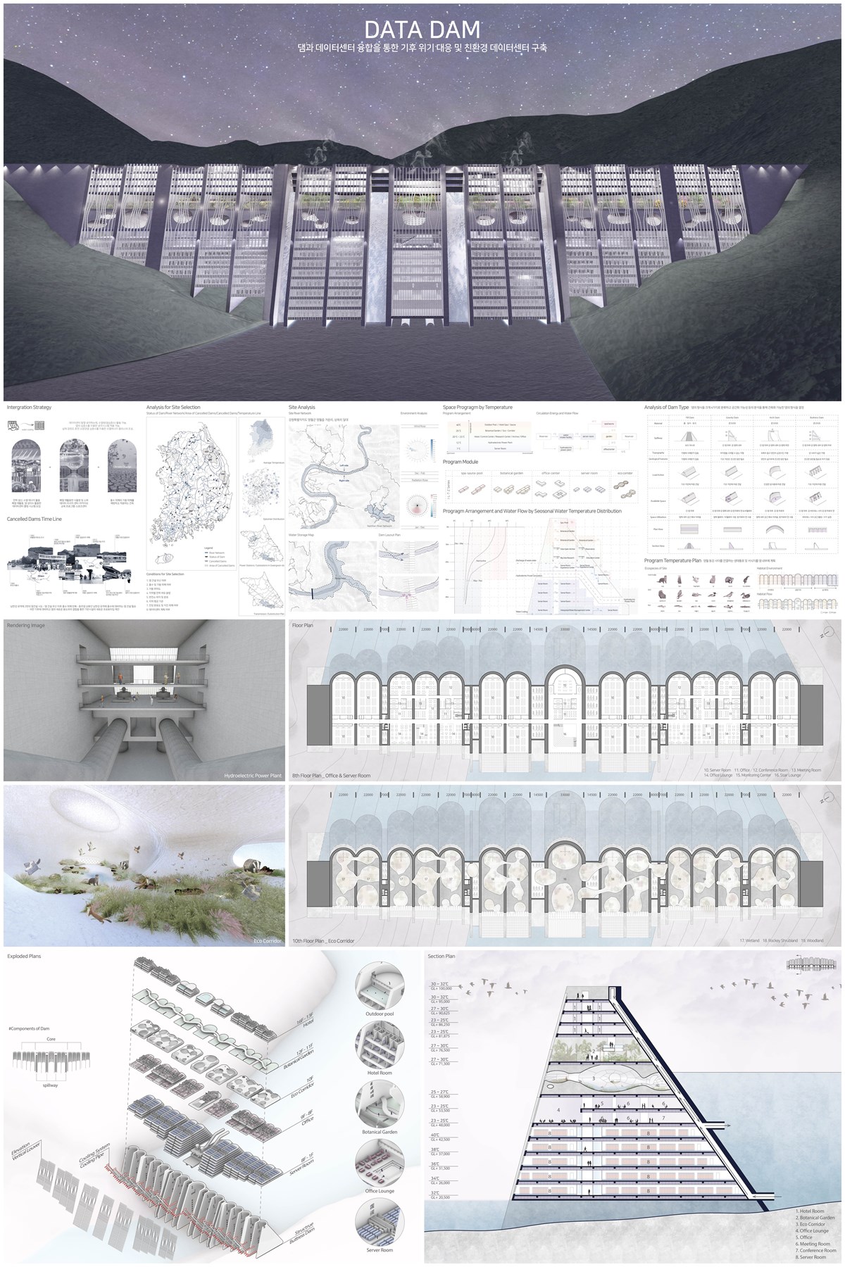 이 프로젝트는 버트레스 형식의 댐으로 반복적으로 홍수 피해가 반복되는 남한강 유역의 강원도 영월에 위치하며 여수로를 갖춰 홍수를 조절할 수 있으며, 수력 발전시설을 갖춰 데이터센터 및 프로그램에 필요한 전력을 자체 생산할 수 있다. 데이터센터의 쿨링 시스템은 댐 심층수를 사용하는 수냉식과 강원도의 차가운 외기를 활용하는 공냉식을 결합하여 계획하였다. 댐 심층수는 물 순환 시스템에 의해 저수지 – 서버실 – 스파/사우나 – 식물원 – 생태 코리더 - 실내 프로그램 – 저수지 순서로 댐체 내부를 순환한다. 또한, 댐체 내부에 영월의 생태 환경을 재현한 생태 코리더를 조성하여 동식물의 서식지를 제공하였다.