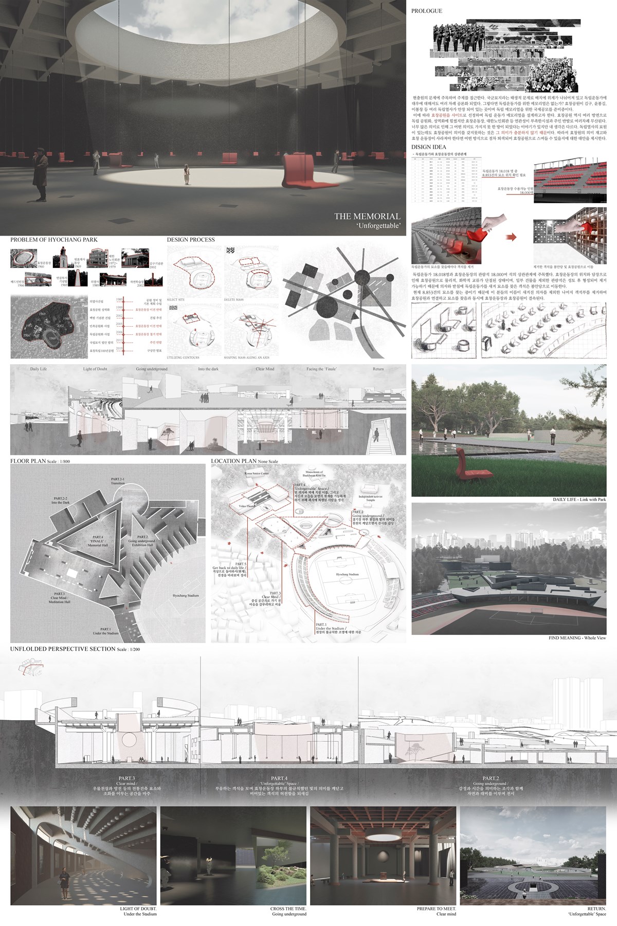 효창운동장 객석 하부로 진입을 유도하고 끝없는 통로와 어둑한 공간을 마주한다. 한국 풍경 사진전이 열리고 있으며, 천장의 불규칙한 빛에 의구심을 가진다. 긴 통로 끝은 다른 재료의 공간이 펼쳐지며 옅은 물소리가 들리기 시작한다. 감정과 시간을 의미하는 조각과 함께 자연과 대비를 이루며 전시된다. 원형의 외부공간에 다다르면 이전 물소리의 정체를 이해하고 시각과 청각이 제한된 상태에서 잡념을 잊고 다음 공간으로 이동을 준비한다. 정제된 콘크리트 속에서 조각품에 집중하며 이동한다. 높은 층고와 비교적 좁은 공간은 긴장감을 고조시킨다. 한국 전통건축요소와 조화를 이루는 거대한 공간을 마주한다. 중심공간으로 가기 전 심신을 가다듬고 명상의 시간을 가진다. 좁고 긴 통로를 지나며 대리석에 비치는 자신을 얼핏 보게 된다. 중심 공간에 도달하면 부유하는 수많은 객석을 보며 효창운동장 하부의 불규칙했던 빛의 의미를 깨닫고 비어있는 객석의 허전함을 되새기며 숨죽여 바라본다. 벽에 새겨진 18,000여 명의 독립운동가 이름을 바라보며 규모에 압도된다. 벽을 둘러보다가 문득 비치는 자신과 하늘을 보며 생각에 잠기고 천천히 현재로 복귀한다. 다시 거친 콘크리트와 함께 생각을 정리하며 일상으로 돌아간다. 지상으로 올라오면 탁 트인 전경과 함께 효창운동장을 바라본다. 효창공원과 효창운동장은 독립운동가의 묘소를 찾을수록 긴밀하게 연결되면서 시간의 흐름과 모든 존재의 소중함을 느낀다. 효창운동장의 의미는 점차 퇴색되며, 효창공원으로 흡수되면서 충분하지 않았던 의미를 찾아간다. 나아가 일상 속 추모를 통해 감사함을 느끼고 '잊을 수 없는' 공간이 된다.