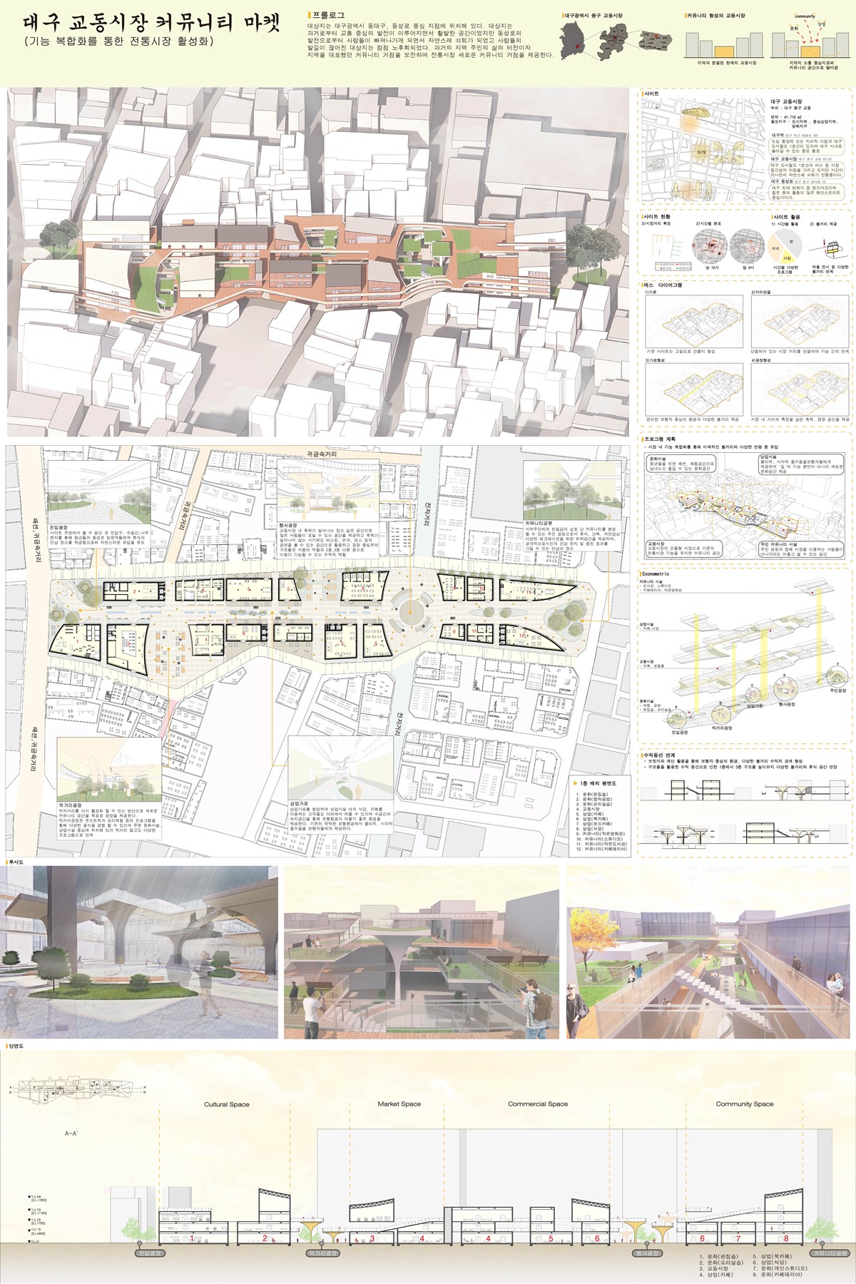 전통시장은 공동화 현상에 직면해 있으며, 동대구역과 동성로 인근에 위치한 교동시장도 예외는 아닙니다. 이 시장은 지역 경제와 문화의 중심지였으나, 시설 노후화로 현대적 요구를 충족하기에는 한계가 있습니다. 본 프로젝트는 교동시장을 현대화하고 재개발하여 지역 경제를 활성화하고 새로운 문화적 중심지로 재탄생시키는 것을 목표로 한다. 본 제안은 가로 공간을 재구성하여 낙후된 상가를 점진적으로 철거하고, 판매공간, 상업공간, 문화공간, 공동체공간을 효율적으로 재배치합니다. 이 공간들은 긴 보행자 전용 아케이드와 광장들로 이어진 선형적 가로 공간에 배치되어 입체적인 경험을 제공합니다. 특히, 대게 비어 있는 2층 레벨의 공간을 활성화하기 위해 다양한 수직동선과 옥상 정원을 통해 다양한 진입경로를 제공합니다. 또한, 분리된 기능들 사이 상징적인 캔틸레버 구조 모듈로 만들어진 행사광장을 통해 다양한 문화 및 기획 이벤트 공간을 제공합니다. 본 제안은 기존 전통시장의 기능을 분석하고 시장의 특색에 맞게 재배치하여 도시 보행과 연계합니다. 기능과 기능 간의 연계를 강화하기 위해 문화광장 공간을 창출함으로써 지역 사회의 결속력을 증진시키는 데 중요한 역할을 할 것입니다.