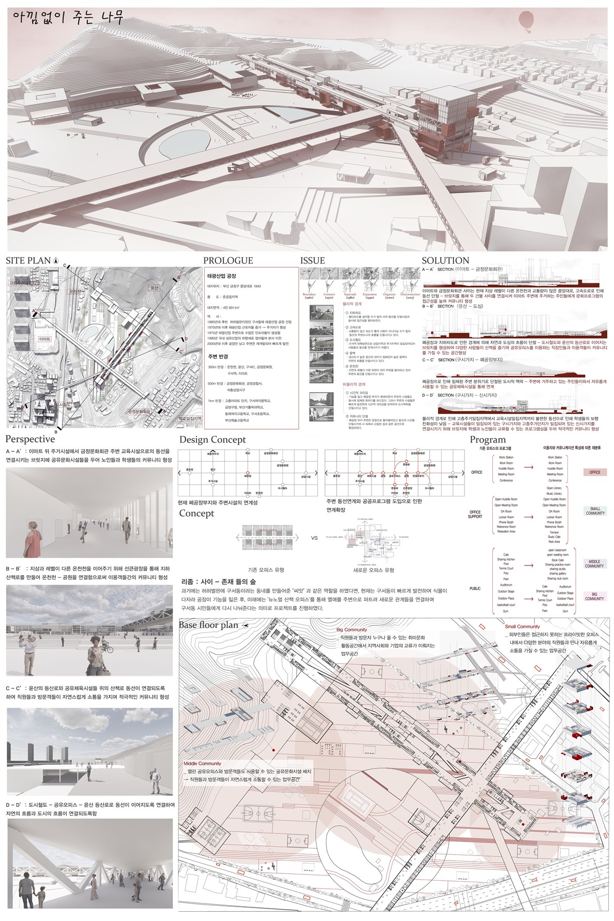 본 작품은 구서동의 역사적 맥락과 현재의 도시적 요구를 잘 연결하고 있다. 과거 태광산업공장이 지역 발전에 기여했지만, 기능 상실 이후 단절된 공간 문제를 인식하고, 이를 해결하기 위한 창의적인 접근이 돋보인다.