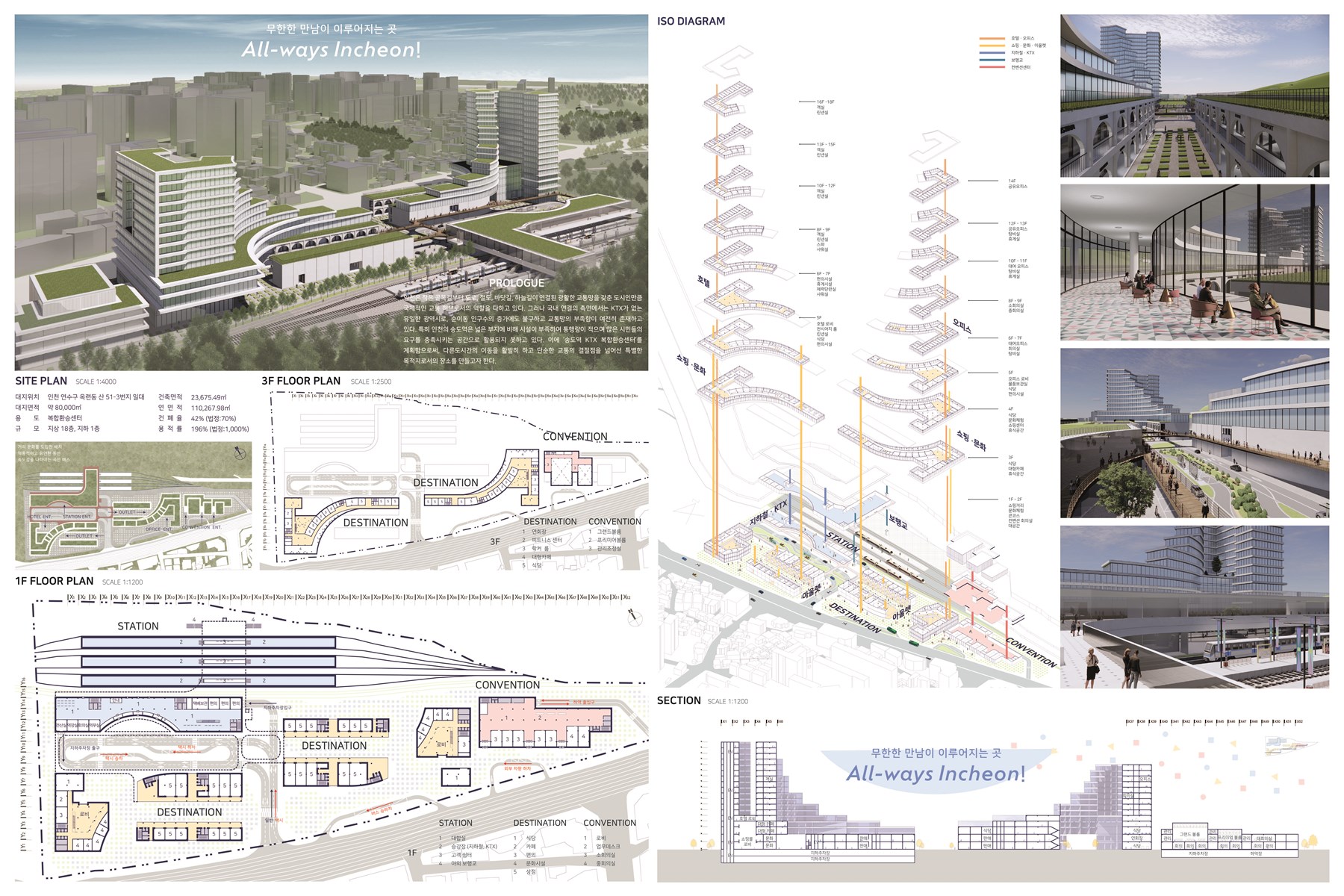 이번 설계는 인천의 교통환승시설 뿐만아니라 환승지원시설을 같이 계획함으로써, 문화와 이벤트를 위한 공간을 포함한 복합적인 플랫폼을 목표로 하고 있다. ‘station(여행을 위한 이동공간)’, ‘destination(여가와 휴식을 위한 문화공간)’, ‘convention(소통을 위한 대회의공간)’ 이렇게 총 세 건물로 분류해볼 수 있으며 이를 통해 어느 누구나 활발하게 이용할 수 있는 공간을 계획하였다. 이중 ‘destination’과 ‘convention’은 복합환승센터를 단순히 이동목적만으로 사용하는 것이 아닌 다양한 프로그램을 통해, 머무르며 무한한 경험을 할 수 있는 목적성을 가지고 있다.