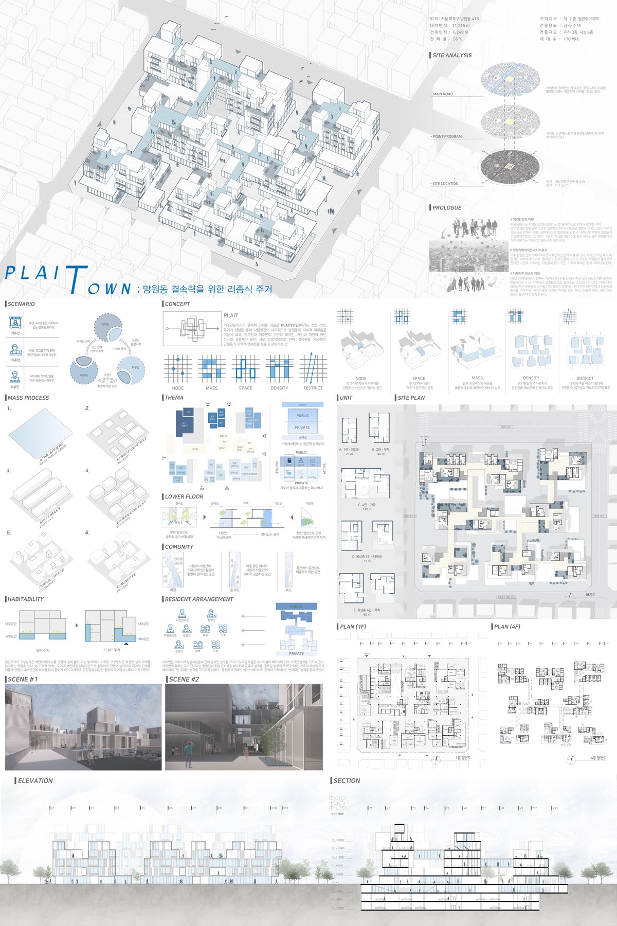 본 작품은 아파트 위주의 우리나라 주거환경 내에서 중소 규모의 공동주거를 제안하는 작품으로서 차별적인 공동주거에 대한 시도라고 볼 수 있다. 본 대지는 망원시장 인근으로 상업시설과 주거지, 거주민과 방문객, 노년층과 젋은층이 어울리는 지역으로서 가로공간이 활성화된 대지에 Plait(엮음)라는 개념을 도입하여 이질적 요소간의 자연스러운 조화를 꾀하였다.