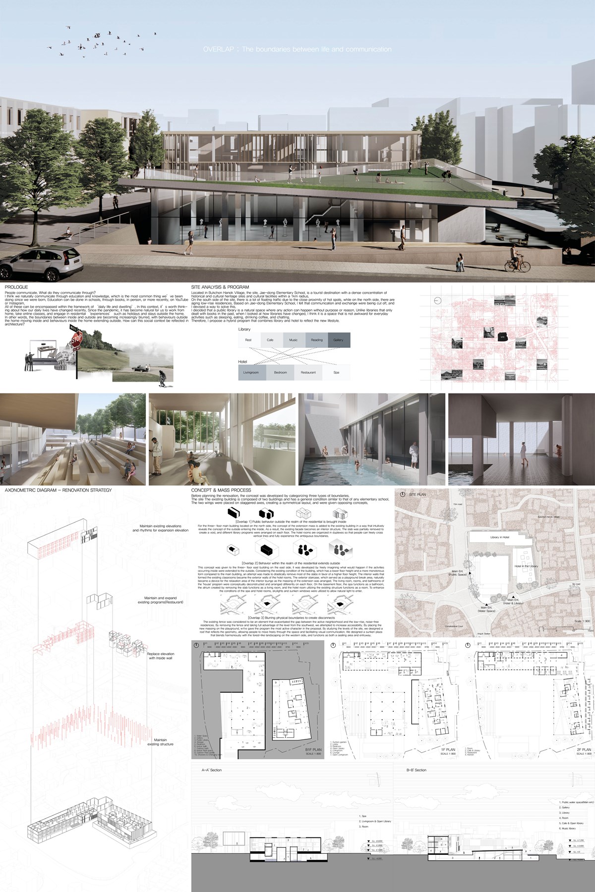 Overlap은 재동초등학교 리노베이션 계획안이다. 사이트 가회동은 서울의 역사적 층위와 현대적 삶의 패턴이 공존하는 독특한 맥락을 지니고 있다. 대지에 대한 다층적인 분석과 기존 건축물의 역사, 공간구조, 재료, 치수에 대한 치밀한 연구를 기반으로 도서관과 호텔의 결합이라는 창의적인 프로그램을 도출하였다. 현대인들의 라이프스타일을 반영한 시설의 가능성에 주목하며 초등학교 건물이 지닌 전형적 공간구조를 활용하여 디자인을 발전시켰다. 사적 공간과 공적 공간, 그 사이의 여러 위계를 소통을 위한 다양한 공간적 분위기로 구성하며 학교 공간의 전형성을 흥미롭게 해체한다. 대지의 지형, 주변 맥락과 현대인들의 삶에 대한 세심한 관찰은 운동장, 기존 구조체, 지하공간 등에 여러 건축적 장치를 적용하며 섬세한 증개축 안으로 발전된다. 거실과 같은 열람실, 지역 커뮤니티에 개방된 라운지, 스파와 같은 새로운 프로그램 공간은 그 결과물이다. 학령인구 감소로 인해 증가하고 있는 유휴공간으로 건축적 대안이 긴요한 학교 시설에 대한 리노베이션으로 의미를 지닌다. 더불어 도서관과 호텔 프로그램의 잠재력을 밀도 높게 탐구하여 현시대에 요구되는 시설적 혁신을 제안하고 있다.