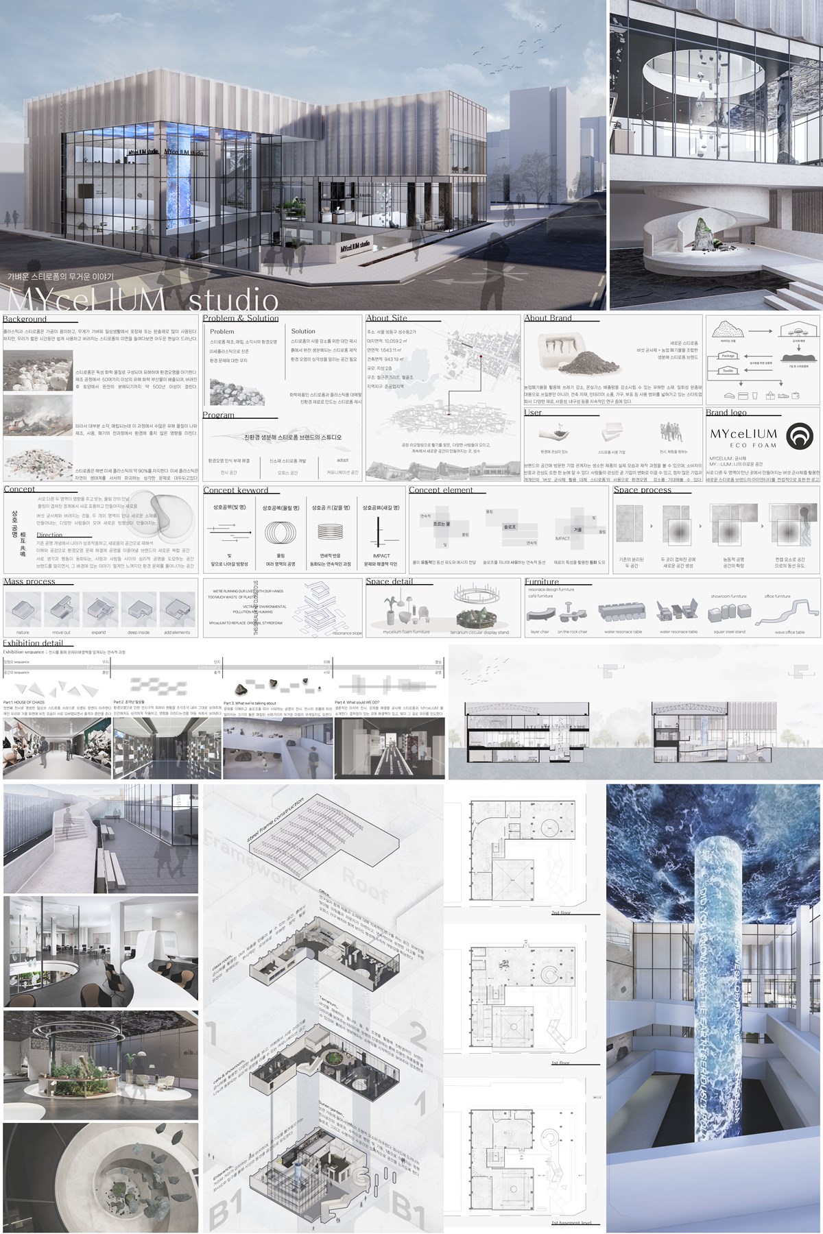 김가연 학생의 ‘버섯 균사체 활용 스티로폼 브랜드 스튜디오’는 환경 문제의 심각성 자각할 필요성을 깊게 이해하고 그것을 창의적이고 실질적으로 접근한데 큰 의미가 있다. 단순히 친환경 소재의 사용을 도모하는 데 그치지 않고, 환경 문제에 대한 인식을 높이며 해결 방안을 제시하는 복합적인 공간으로 설계하였다.