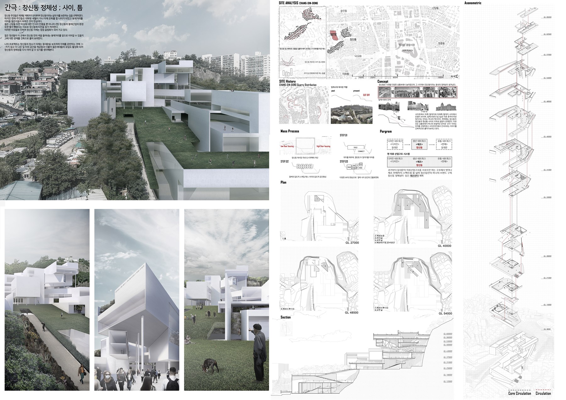 간극이라는 단어가 의미적인 부분뿐 아니라 대지안에서도 느껴진다. 사이트 주변의 끊어진 맥락을 이어주며 내부 동선에서 절벽의 공간이 보였다가 안 보였다 하는 시퀀스가 생기는 거 같다. 매스 자체가 끊어져있던 두 대지를 이어주며 역할을 하며 매스 형태 또한 거칠며 강한 절벽의 이미지에 강한 매스로서 강하게 부딪히며 절벽의 압박감을 강하게 받아치는 느낌을 준다. 절벽 대지가 매스 사이사이에서 보이며 매스 형성 일부가 대지의 형태를 따르며 대지에 스며드는 느낌 또한 준다. 창신동 절벽이라는 일제의 잔재의 역할이 부정적 일 수도 있지만 매스 사이사이에서 절벽이 보이며 내부에서도 보이는 공간을 주며 매스로 절벽이라는 일제의 잔재를 부정하는 것이 아니라 잊지 말아야 한다는 의미와 절벽을 잘 이용하여 계획한 거 같다.