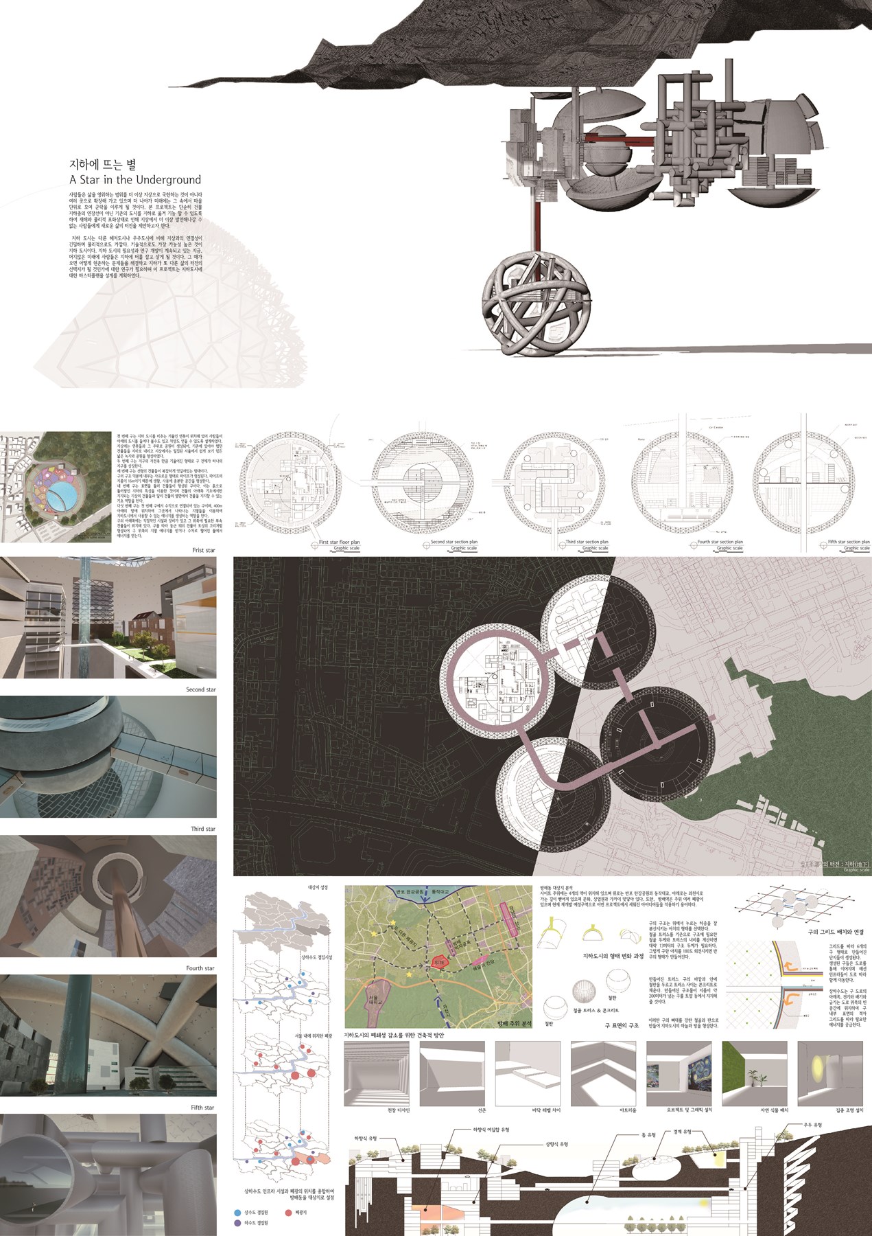 본 프로젝트는 복잡하고 협소한 도시공간 이용의 효율화에서 야기되는 도시문제에 대한 건축적 해결방안으로 제시되었던 “지하도시“ 연구를 바탕으로, 인류를 위한 제2의 생존환경으로서 부각되고 있는 지하도시에 대한 순수한 모험심과 건축에서의 새로운 가능성을 모색하여 구체적인 마스터플랜을 제안하고 있는 점이 우수한 작품이다. 서울 시내 5개 폐광지역의 타당성 조사를 바탕으로 방배동 재개발구역을 대상지로 선정하였고 Human factors, Physical factors, External factors가 반영된 삶의 터전으로서, 지하도시의 기본단위로 제시되고 있는 ”지하에 뜨는 별“은 물리적 한계를 뛰어넘어 지하세계에 새로운 질서와 공간을 창조하도록 가정하여 유기적으로 성장할 수 있는 underground constellation을 구성할 수 있도록 계획되었다. 단순히 유토피아적 세계관으로 인류를 위한 새로운 생활환경으로서의 미래 역할만을 부여하는 것에 그치지 않고 공간의 특성을 활용한 동선을 바탕으로 도시공간의 경험과 기능을 다양화하고 구체적인 건설방법과 구조물 연구를 통해 성장형 archipelago의 가정을 정립한 창의적이고 수준 높은 상상력이 돋보이는 작품이다.