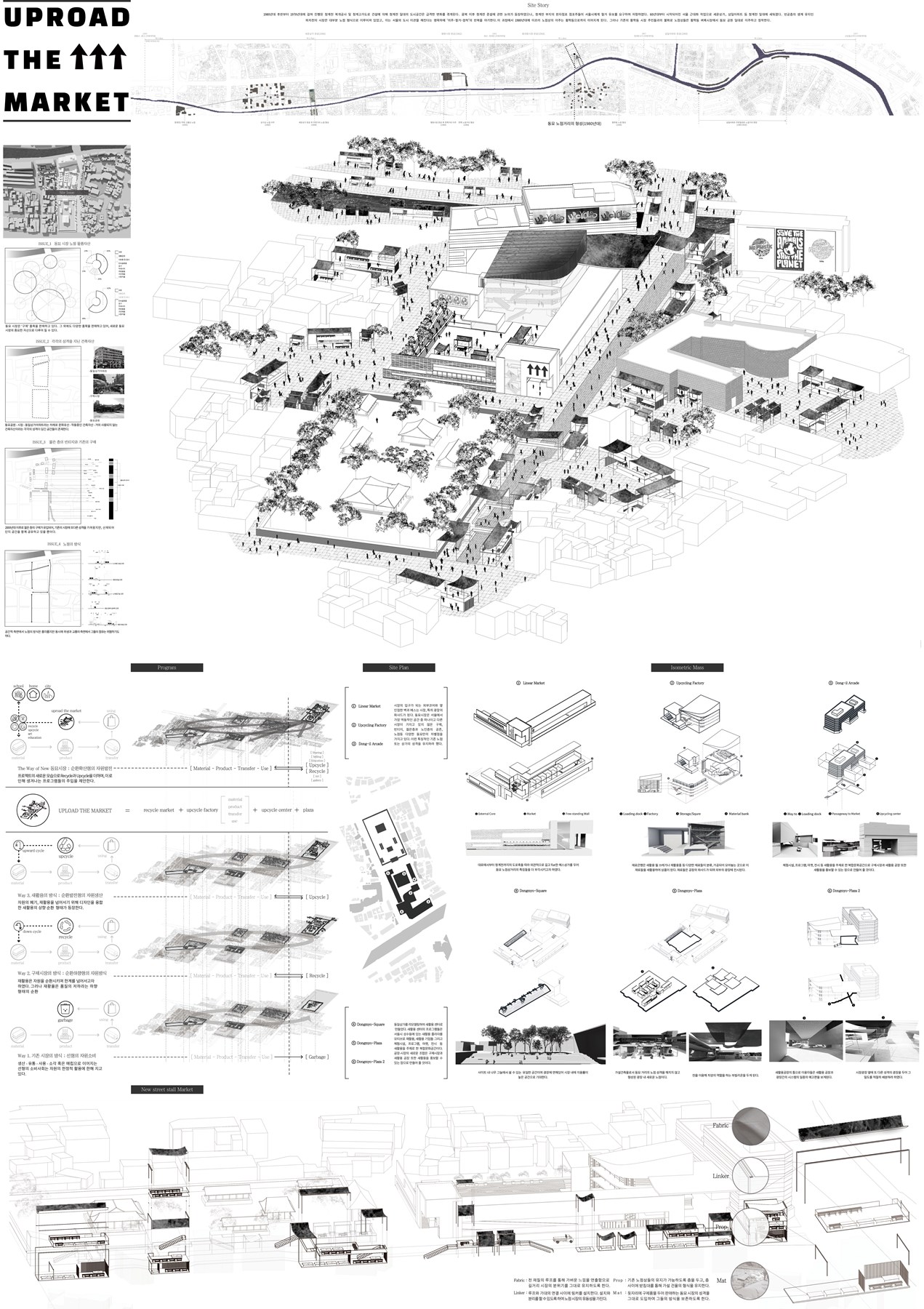 Upraod the Market. 서울 속 시장의 역사는 길에서 시작하였고, 사람들은 지금까지도 길을 따라 시장을 누비며 필요한 물품을 구매한다. 동묘역 앞에 들어선 동묘 시장 역시 옛 모습을 간직하며, 갖가지 구제 물품들을 길에 들여놓고 있다. 여기에 'Uproad the Market'은 Upcycle(새활용) 시스템을 도입하고자 한다. 도로에 늘어선 시장과 보행로를 입체 동선으로 구축하여 UpRoad로 완성하였다. 길거리 시장의 문제를 극복하고 구제 물품을 다루는 시장의 특성에 '새활용' 개념(수집한 폐기물로 새로운 제품 디자인)을 더하여 프로그램을 복합화하였다. 기존 대지에 존재하던 근대 아파트는 리모델링되어 새활용 플라자로서 기능하고, 곳곳에 산재되어 있는 시장 내 장소들을 큰 광장으로 통합하였다.