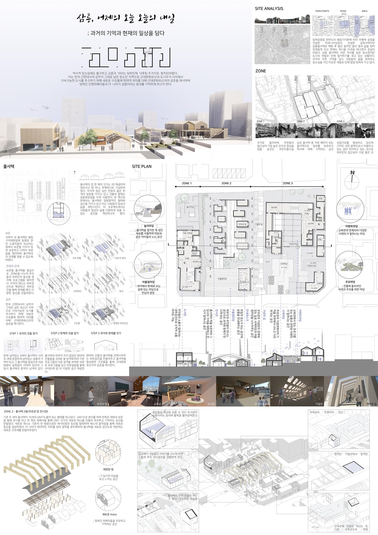 줄사택은 20제곱미터 남짓한 유닛들이 붙어 있는 형태를 하고 있으며 일방향적인 형태와 공간으로 사람들의 삶을 제한시켰다. 이를 주변 상황에 따라 주민들의 주거공간과 맞닿아 있는 곳, 줄사택이 위치한 곳, 외부인의 행위가 많이 일어나는 곳 세 가지로 zone을 나누었다. 주민들의 일상과 외부인의 공간이 어우러져 삼릉이라는 동네에 활력을 불어넣고자 했다. 줄사택은 보존을 통해 추모관 및 전시관으로 만들었다. 줄사택을 유닛으로 분리하여 한 쪽은 재현과 보존을 통해 전시를 하고 한 쪽은 재해석을 통해 유닛 크기의 새로운 매스를 만들어 추모하고 기억하는 공간을 만들었다. 기존의 한 방향으로만 제시되었던 동선을 탈피하여 매스의 움직임을 통해 새로운 동선을 생성하였고 더 나아가 현대적인 의미를 담아 영역을 분리해주며 줄사택을 새로운 공간으로 제안하는 새로운 구조체를 만들어주었다. zone 1은 주거영역과 맞닿아 있는 공간으로 주민들의 일상과 삶을 담아 내는 공간을 만들고자 하였다. zone 3은 외부인들의 활동을 담을 수 있는 공간으로 만들었다. 이 세 가지의 zone들이 외부공간을 통해 연결되고 연계되어 하나로 어우러지는 동네를 만들고자 하였다.
