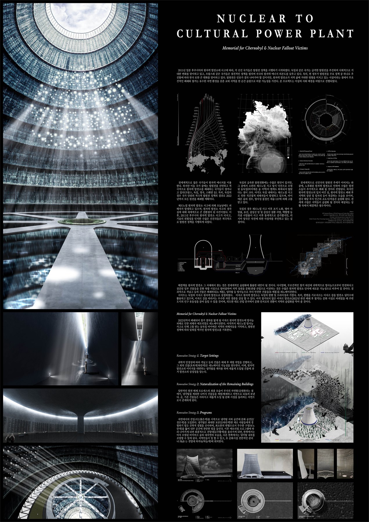 | 작품설명 | 2011년 일본 후쿠시마의 원자력 발전소에 사고에 따라, 각 선진 국가들은 탈원전 정책을 시행하기 시작하였다. 독일과 같은 국가는 급격한 탈원전을 추진하며 사회적으로 거대한 변화를 맞이하고 있고, 프랑스와 같은 국가들은 점진적인 정책을 펼치며 자국의 원자력 에너지 의존도를 낮추고 있다. 특히, 현 정부가 탈원전을 주요 정책 중 하나로 추진함에 따라 한국 또한 큰 변화를 맞이하고 있다. 탈원전은 인류가 결국 나아가야 할 길이지만, 원자력 발전소가 지역 삶에 거대한 영향을 미치고 있는 시설이라는 점에서 무조건적인 폐쇄와 철거는 유수한 자연 환경을 갖춘 교외 지역을 한 순간 슬럼으로 바꿀 가능성을 가진다. 본 프로젝트는 이상의 사회 배경을 바탕으로 진행되었다. 결과적으로 원자력 발전소의 무조건적인 폐쇄와 철거 대신에, 방사능과 오염에 대한 과학적 안전성에 따라 재생할 건물과 폐기할 건물을 철저히 분리한 뒤, 일부 건물을 재생하는 것을 제안하는 바이다. 실제로 세계적으로 수많은 원자력 발전소가 오는 10년 안에 그 수명이 다하게 됨에 따라, 발전소에 쓰인 철 등을 적극적으로 재활용하는 방안이 출현하고 있고, 일부 지역에서는 건물 또한 재활용하는 방안이 제시되고 있다. 다른 국가들보다도 급격히 탈원전화가 진행되고 있는 동독일 에센바흐(Essenbach) 지역의 이자르 원자력 발전소를 사이트로 설정하였다. 이때, 이자르 원자력 발전소를 ‘체르노빌 원자력 발전소 사고’에 의한 직/간접적 피해자들을 추모하는 메모리얼로 탈바꿈한다면 상징적인 의미가 클 것으로 판단하였다. 특히, 시퀀스(Sequence)에 따라 느껴지는 바가 다르도록 각 공간에서 빛을 활용하는 방안에 차이를 주었으며, 이를 통해 원자력에 의한 고통을 치유하고 피해자를 기억하는 공간, 또 마지막으로 독일에서 사라져갈 원자력 기술에 대한 기록소를 제안한다. |