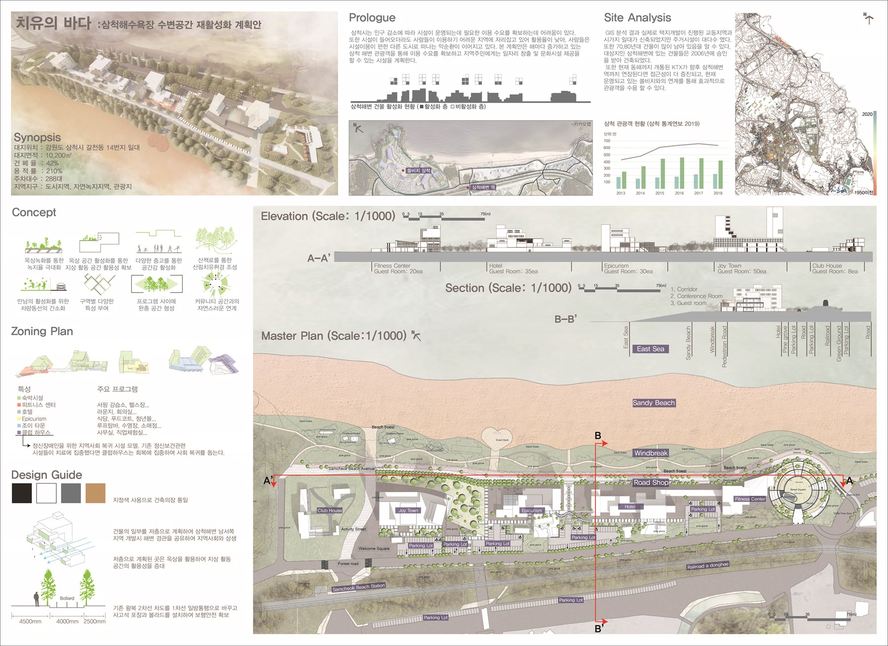 이러한 변화에 부응하여, 본 설계안은 낡고 쇠락한 삼척해변의 공간적, 경관적 인프라를 개선하여 새로운 지역관광자원으로 재활성화하고자 하였다. 수변 가로와 연계된 저층의 근린상업시설을 입체적으로 배치하여 접근성과 이용의 편의성을 높이고, 보행 접근이 가능한 저층의 옥상공간을 활성화하여 지상 활동공간의 활용성을 높였다. 다섯 개 구역에 분산 배치된 중소형의 숙박시설은 기존의 진부한 모텔들을 대체하고, 인근 대형 관광숙박시설과 대비되는 공간적 다양성을 제공할 것이다. 해변에 인접한 동측 접근도로의 차량 통행을 억제하여 보행전용성을 높이고, 서측 철길을 관통·연계하는 동선체계 등이 고려된다면 영역성의 확장과 더불어 고질적인 주차난도 해결할 수 있을 것이다. 인접한 삼척해변역의 특화 설계방안을 함께 검토할 것을 추가로 권한다.