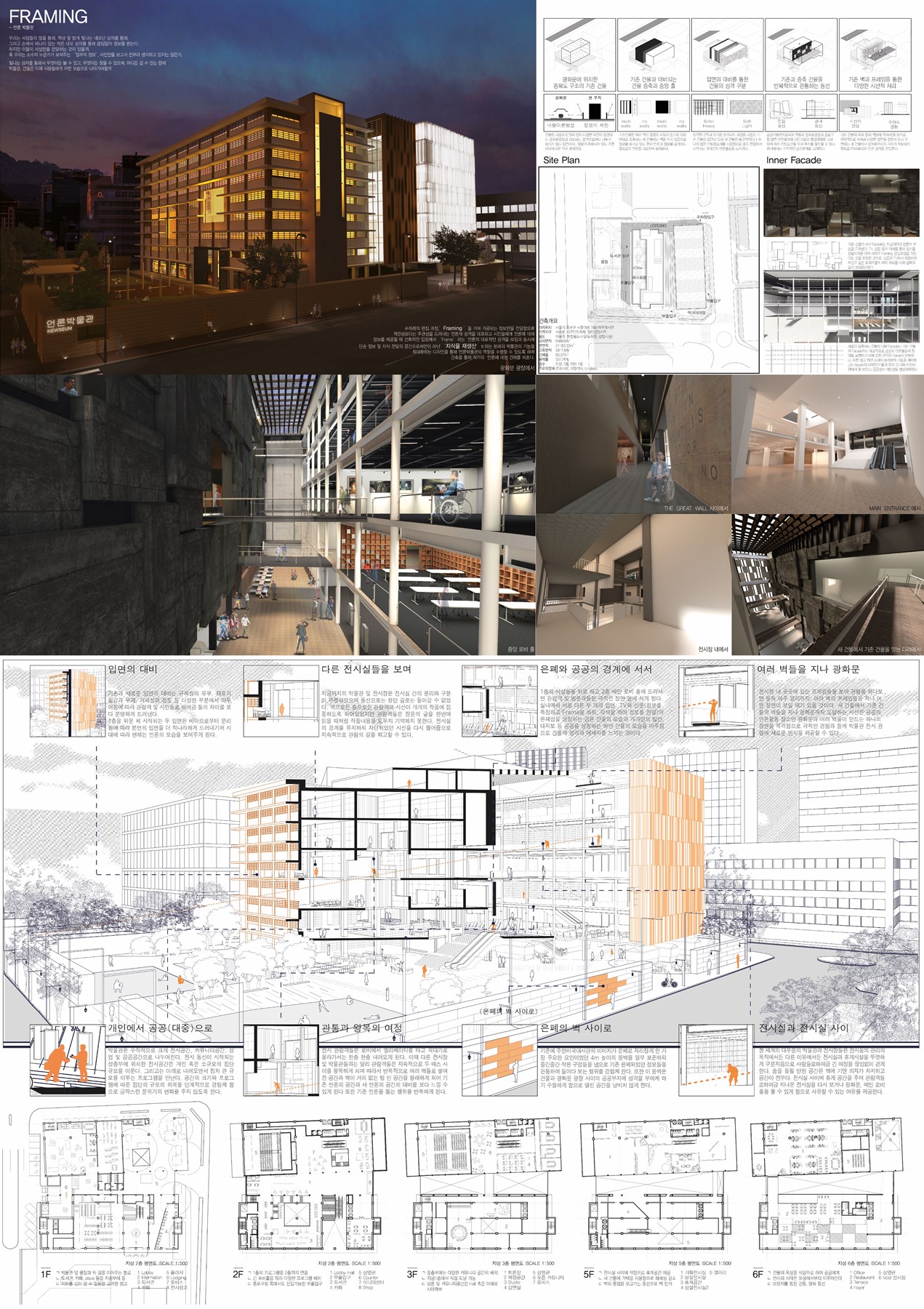 지도교수 작품평 본 작품은 최근 다시 붉어지고 있는 언론에 대한 신뢰 이슈와 형식 및 전시의 형태가 고착화되어가고 있는 박물관에 대한 학생의 깊은 관심에서 비롯되었다. 광화문광장과 이전이 지연되고 있는 미국대사관의 건축적·위상적 대비, 과거 언론의 모습과 앞으로 지향해야할 언론의 모습의 대비 등 서로 대립되는 특성들을 전시뿐만이 아닌 박물관 전체 디자인에 적용하고자 하였던 노력이 보였다. 내부 facade와 framing을 통한 위치에 따른 시선축의 변화 등 박물관 관람객에게 여러 가지 독특한 박물관의 경험을 주기 위한 공간구성과 동선 및 프로그램은 더욱 기대를 모은다. 1층에서의 진입부와 공공시설 설치 등 접근성과 인근 사이트(소방서)와의 계획 연계. 일대 마스터플랜을 참고하는 등 본 내용 외에도 실제 사이트에 대하여 진중하게 민하였다.) '..언론 박물관'은 언론의 특수성으로 인하여 이를 다루는 박물관이 전세계적으로 몇 개 없지만, 박물관의 기능과 지향점, 건축가의 박물관 설계에 있어서의 역할 등에 대하여 고민한 흔적이 돋보였기에 본 작품을 추천합니다.
