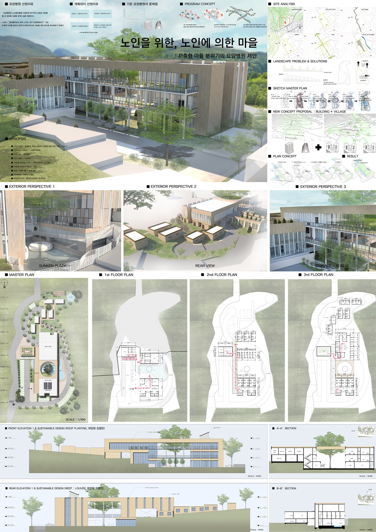 전체 배치계획에서 진입부에 병동부를 배치하여 접근성을 높였고 가장 상단부에 거주 공간을 배치하여 병동부와 독립적이면서 근접한, 마을 개념의 주거 공간을 계획하였다. 병동부 내부에는 ‘쉼’, ‘휴게’, ‘요양’, ‘힐링’ 등의 공간으로 작은 수공간이 존재한다. 이 공간은 병동부의 진입 공간이면서 ‘힐링’ 등 다양한 기능을 하는 매개 공간이다. 요양병원의 문제를 해결하기 위해 건물을 저층화 시키고, 저층의 공간들이 수평적으로 확장되어 쾌적한 환경을 만들어낸다. 요양병원이 가지고 있는 경직성, 획일성을 탈피하여 편안하게 치료받고 동시에 근접 거리에서 생활하는 주거인접형 요양병원을 계획하였다.