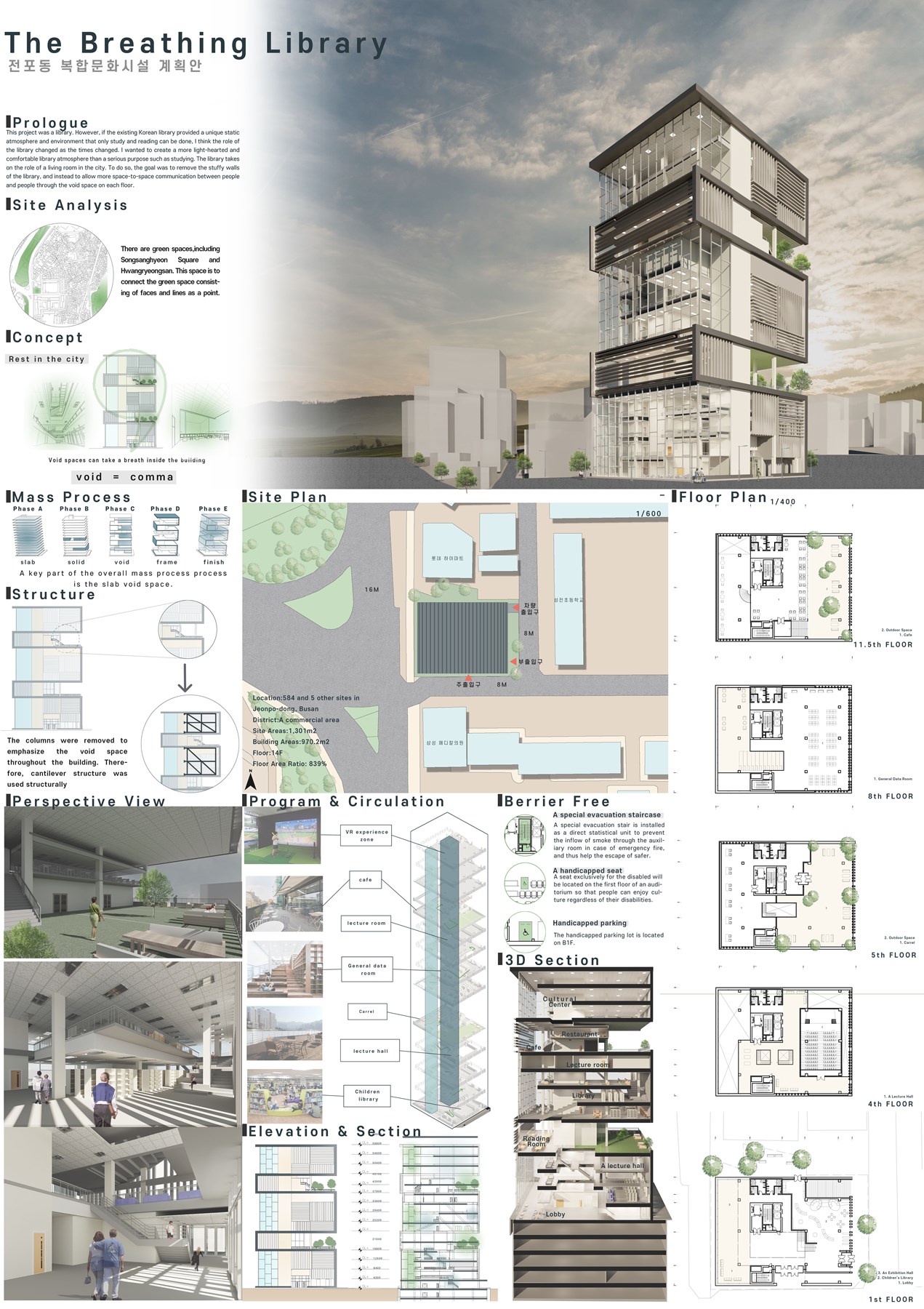 작품설명 The Breathing Library, 말 그대로 숨쉬는 도서관으로 전포동의 빽빽한 건물들 사이의 좁은 대지의 높은 타워형 건물을 통해 대지의 공간을 확보하며 동시에 막혀 있는 시야를 틀 수 있는 외부 테라스 공간을 건물 중간 중간에 위치시켜 육체적으로 이용자가 휴식할 수 있는 공간을 마련하였으며 동시에 건물 내의 보이드적인 공간을 통해 공간의 공기를 순환시키며 간접적인 연결과 함께 동시에 사이트 근방의 송상현 광장과의 식물을 통한 녹지성을 연결시켰으며 이렇게 공간적으로도 경험적으로도 숨 쉴 수 있는 공간을 접할 수 있게 하여 The Breathing Library를 계획하였습니다.