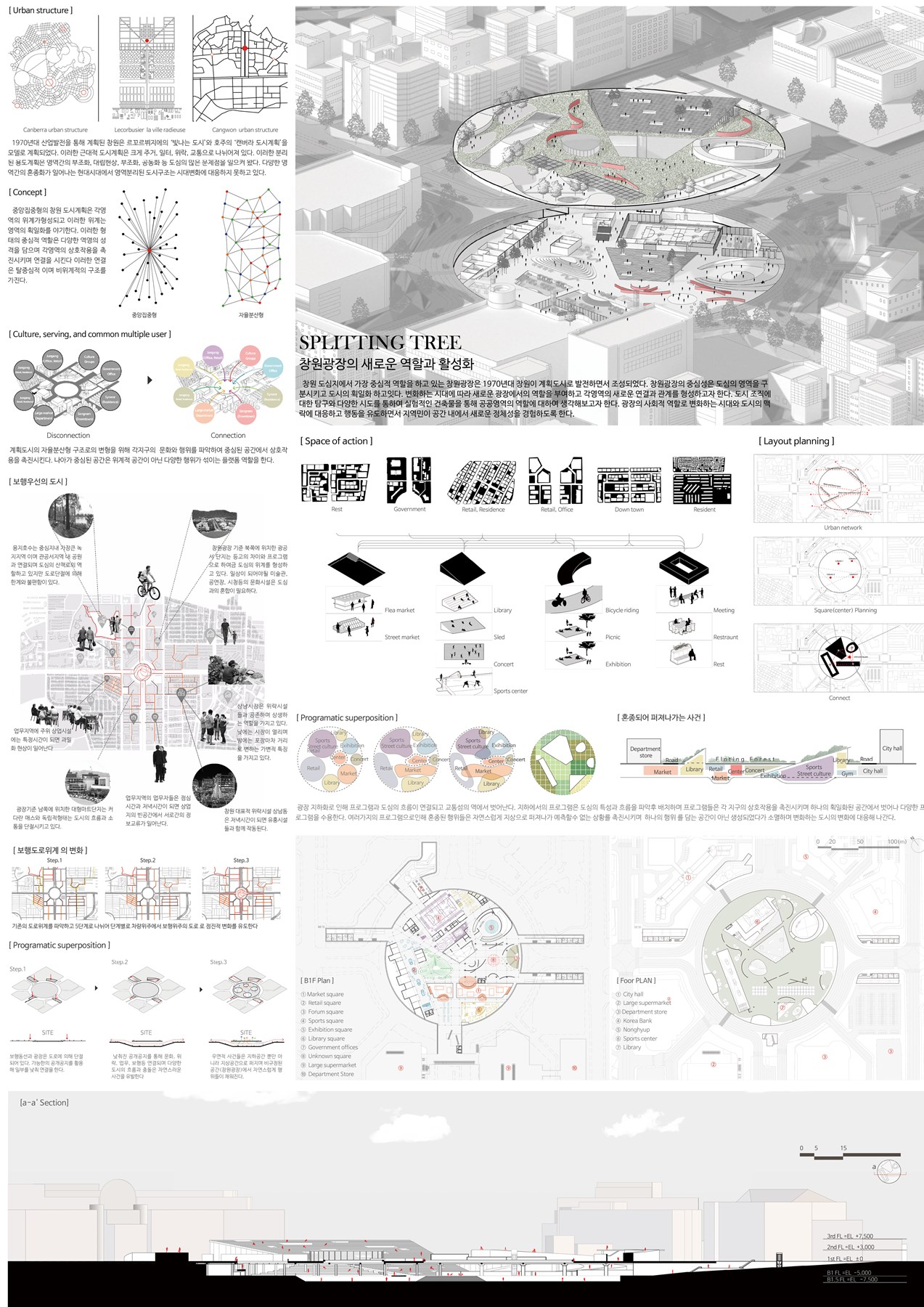 본 프로젝트는 완전한 근대도시 계획방식에 따라 세워진 창원시의 중심광장을 새롭게 조성하는 작업이다. 르 꼬르뷔지에의 “빛나는 도시”가 거의 그대로 구현된 창원시는 주거지·산업·행정·상업·녹지가 명확히 구획되었다. 창원의 산업지역을 잘라내는 국내에서 가장 긴 직선대로(창원대로)와 평행한 원이대로 중심에 원형의 창원광장은 통행도로에 고립되어 있다. 이 프로젝트는 고립된 이 광장에 적극적인 변화를 주고자 한다. 기본적으로 광장 주변 용도구역별로 나뉜 건물이 담는 프로그램을 내부로 끌어들이는 전략이다. 그럼에도 다양한 프로그램을 모아두는 방식은 쇼핑몰과 다른 정교한 전략이 도입됐다. 프로그램의 배치를 구역별로 구분하는 방식 대신에 혼재하도록 하여 근대식 구분법을 없어나도록 하면서도 그 사이에 다양한 빈 공간을 배치하여 우발적인 행위를 발생시킬 수 있도록 했다. 이곳에 역동성과 활기를 만들어 낼 수 있도록 공간의 세세한 배치 즉, 내외부의 관계방식, 지하와 지상의 연계, 시각과 동작을 모이거나 흩어지도록 세밀하게 구성되어 있다. 본 프로젝트는 근대 도시가 지닌 문제의식에서 출발해서 그 문제가 가장 정확하게 보이는 공간을 선택하여 적극적으로 해결한 수작이다.