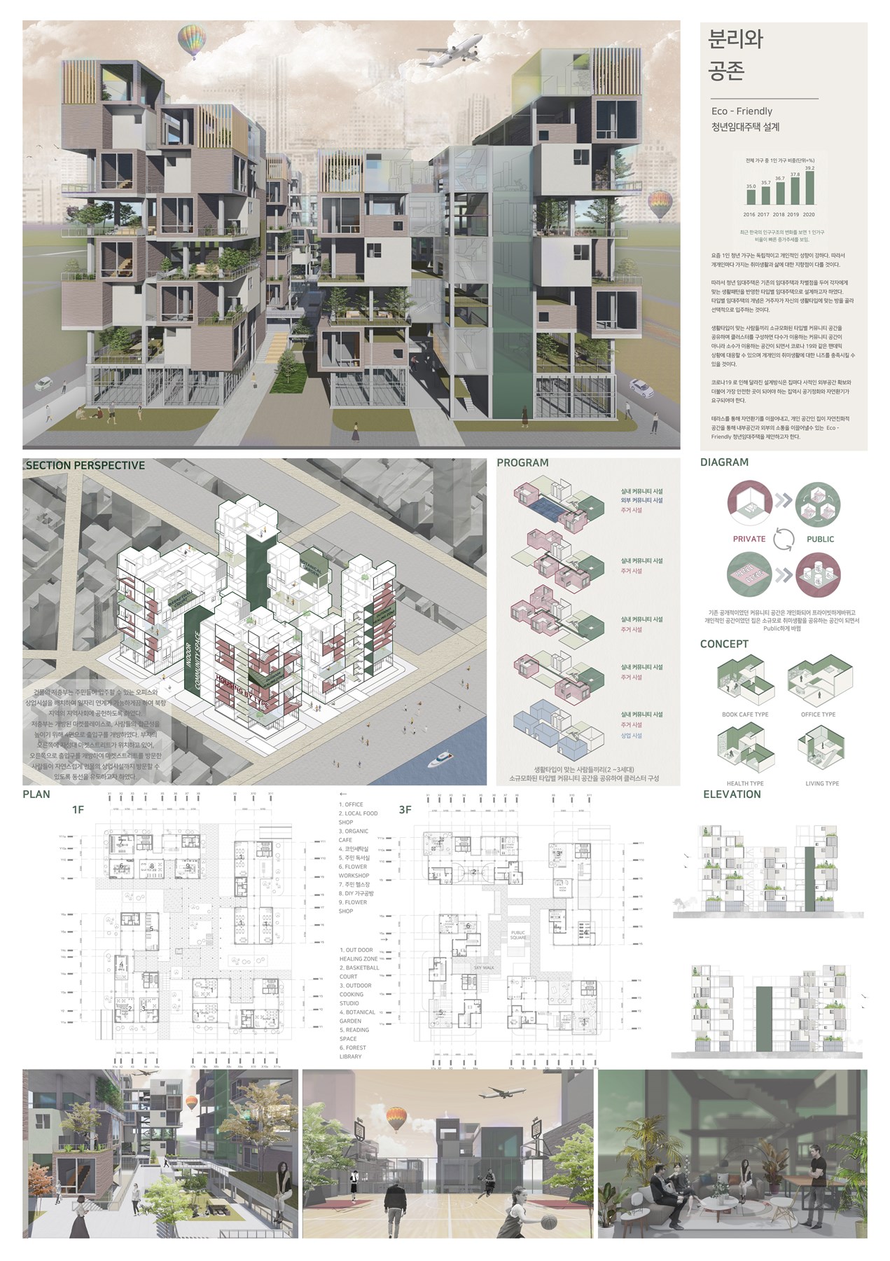 MZ세대의 생활방식에 부합하는 거주형식 제안과 포스트 코로나 시대를 준비하는 미래형 주거건축을 제안하고 있는 본 계획안은 문제선정 능력과 해결방법이 독창적인 학생작품이다.