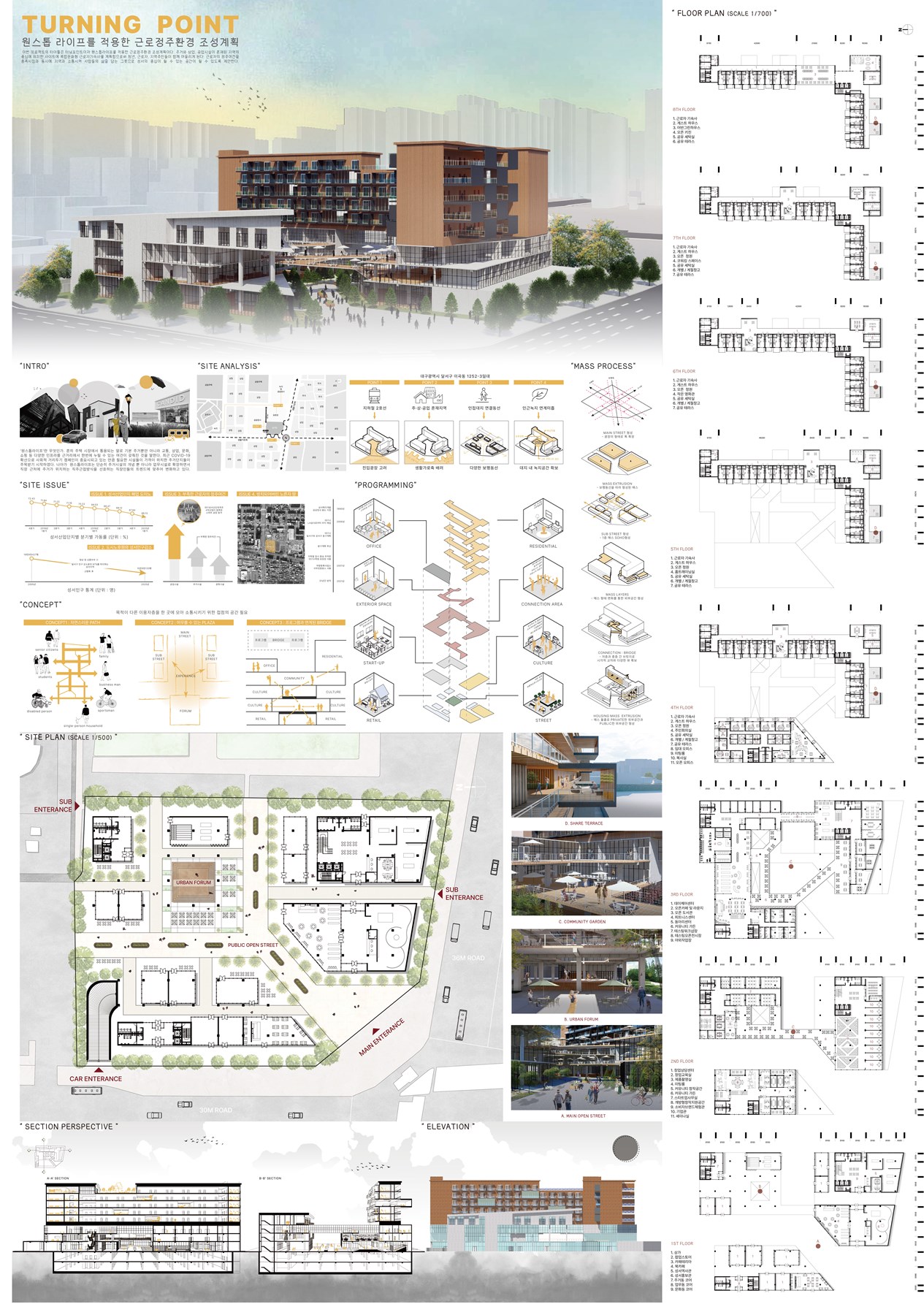 직주근접방식이 근거가 되는 원스톱라이프라는 개념을 도입함으로써 업무, 주거, 문화시설의 복합된 새로운 공간을 계획하여 근로자의 정주여건을 충족시킴과 동시에 지역 커뮤니티 회복을 제안한다.