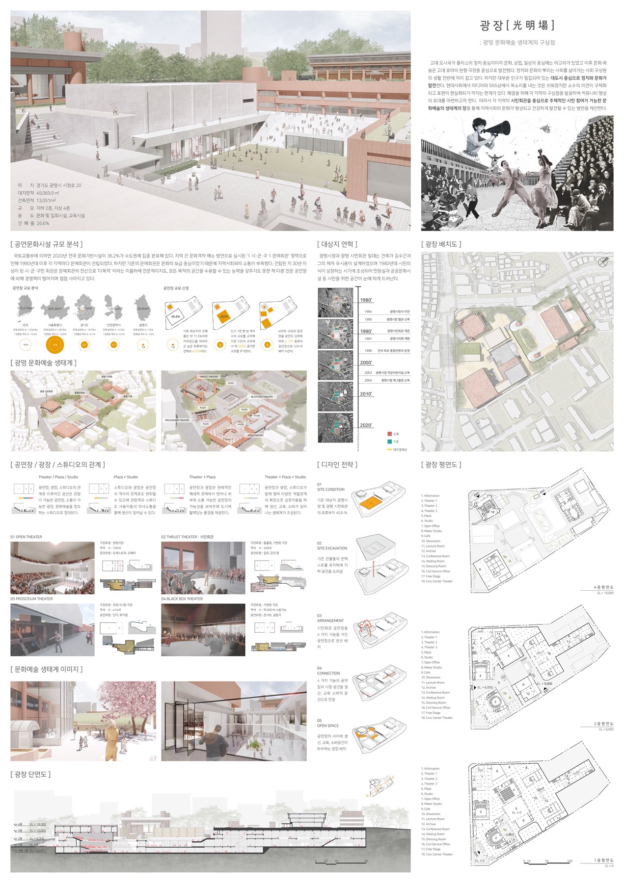 | 지도교수 작품평 | 광장은 경기도 광명시 시청, 시민회관을 포함한 현 권역을 다양한 시민 문화예술 창작과 소비를 동시에 할 수 있는 복합공간으로 전환하는 프로젝트로, 아고라와 같이 시민들이 문화를 향유하고, 문화예술 창작의 주체가 되고, 시정에 주도적으로 참여하는 지역 문화의 생태계 플래폼을 제안한다. 대상지는 공간 김수근과 제자들이 설계한 역사적 층위가 쌓여있는 공간으로 최초의 시청 민원실, 시민회관 도서관 등을 운영을 계획하여 시민 주도의 생활문화 형성을 모색했던 곳이었으며, 현 시대의 요구에 맞춰 운동장 공간을 재편하여 댜앙한 문화시설을 추가하는 작업으로 진행되었다. 기존 시청과 시민회관이 갖는 역사적 층위를 고려하고, 지역의 문화 창작과 소비 생태계를 감안하여 적정 공연장, 스튜디오, 자료실, 민원실을 제안하고, 소비 중심의 문화시설이 갖는 폐쇄적 구조에서 탈피하여 공연장들 사이에 조성된 사이공간인 광장-공연장-스튜디오를 포함한 생산지원 공간 들이 서로 교류할 수 있는 열린 공간구조를 제안하여 문화 생태계의 역동성을 꾀하고 있다. 문화시설은 자연스럽게 열린 민원실과 연계되어 문화를 매개로 시민들의 시정참여를 이끄는 살아있는 마당인 광장, 현대적 아고라를 구현하고 있다. |