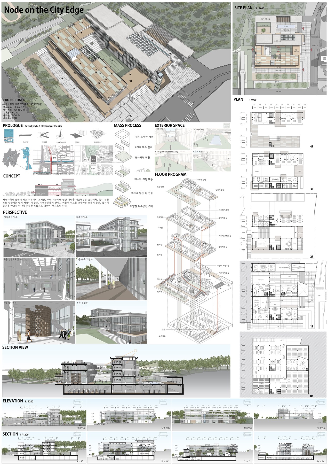 사이트가 위치한 곳은 폭 40미터가 넘는 간선도로에 의한 보행 동선의 단절이 큰 지역이다. 이 때문에 인근에는 동서방향으로 지나는 간선대로에 의해 분리된 남북 양측을 연결하기 위한 보행육교와 보행자도로 등이 계획되어 있다. 하지만 이 보행동선 상에는 건축물이 전혀 없어 이곳을 찾는 사람들은 많지 않은 편이다. 이러한 사이트에 보행육교나 보행자 도로를 이용하는 사람들을 위한 편의시설들이 있는, 이들을 유인할 수 있는 건축물을 계획한다는 것이 이 작품의 주요 기획의도다. 단절이 이루어지기 쉬운 ‘경계부(edge)’에 도시의 각 공간들을 연결해주는 ‘연결점(node)’으로 기능할 수 있는 공간을 제시하는 것이다.