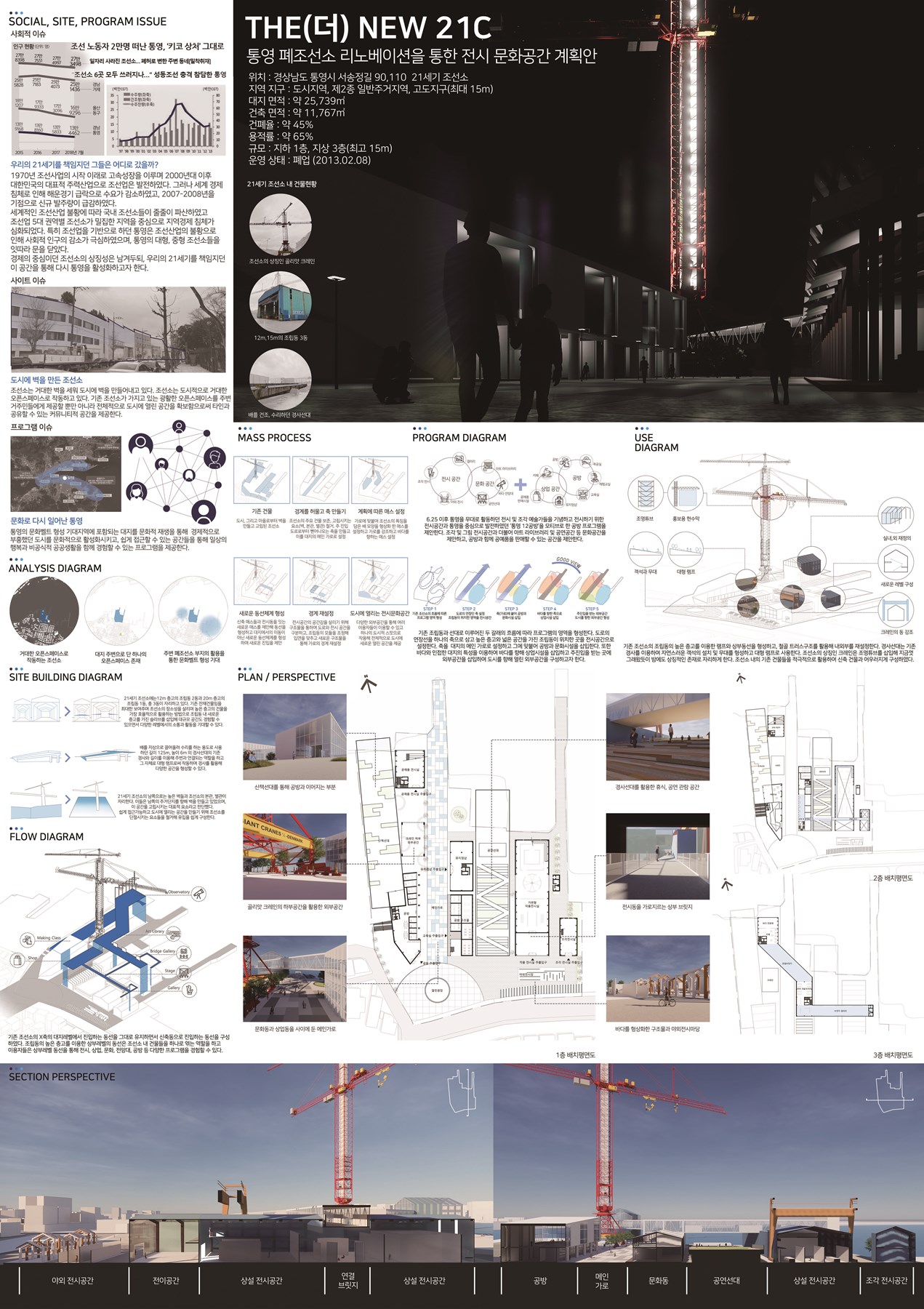 우리의 21세기를 책임지던 그들은 어디로 갔을까? 1970년 조선산업의 시작 이래로 조선업은 고속성장을 이루며 2000년대 대한민국의 대표적 주력산업으로 발전하였으나 세계 경제침체로 인해 조선의 수요가 감소하였고, 2007년을 기점으로 발주량이 급감하였다. 세계적인 조선업 불황에 따라 국내 조선소들도 파산하였으며, 5대 권역별 조선소가 밀집한 지역을 중심으로 경제 침체가 심화되었다. 특히 조선산업을 기반으로 성장한 통영은 이로 인해 사회적 인구의 감소가 극심하였으며, 통영의 조선소들은 문을 닫고 사람들은 일자리를 잃고 통영을 떠났다. 경제의 중심이던 조선소의 상징성은 남겨두되, 우리의 21세기를 준비하던 조선소의 공간을 통해 다시 한 번 통영을 활성화시키고자 한다.