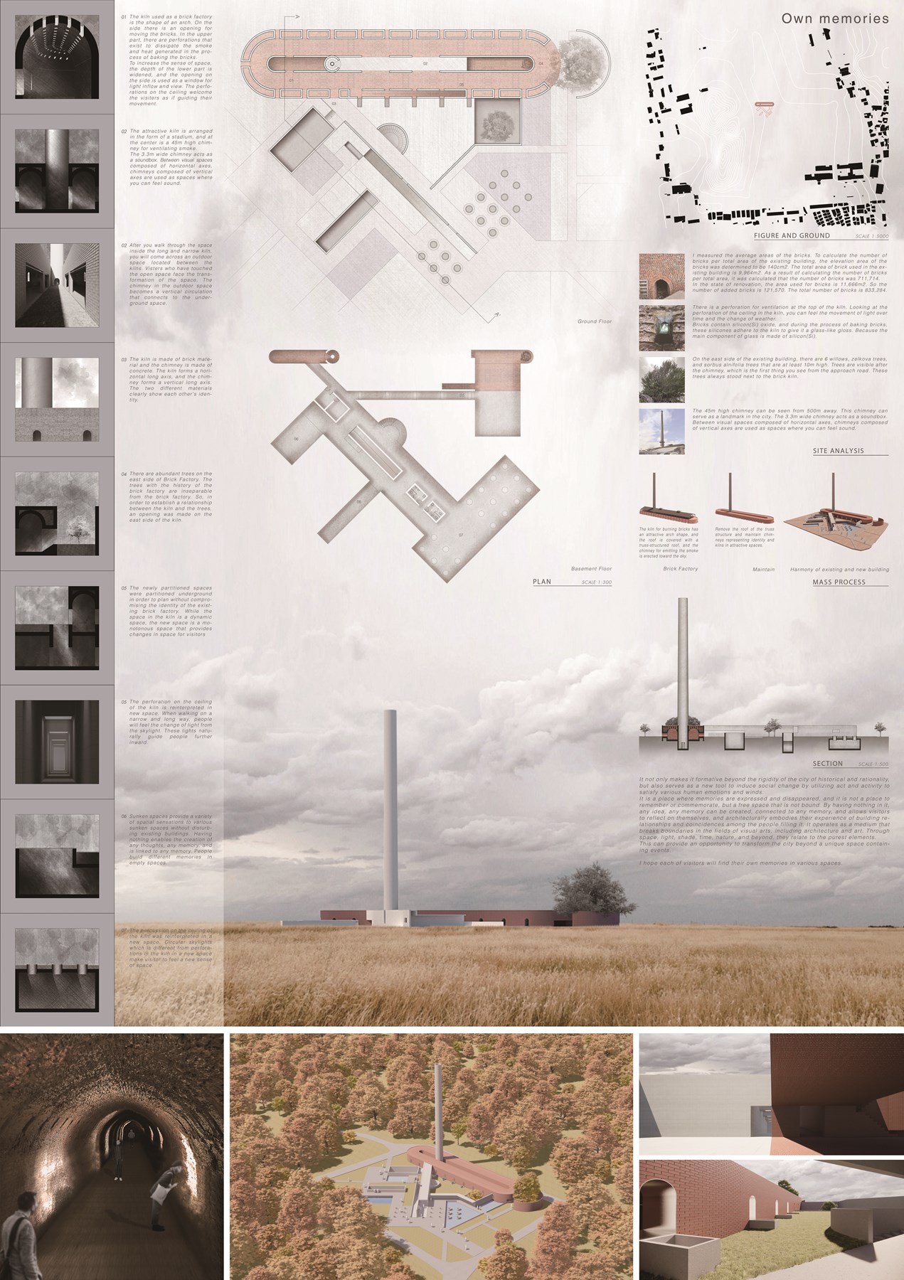 현대사회에서 공간은 있는 그대로 경험되기 이전에 그 공간에 지시된 프로그램이 그 사용법을 고정하는 경우가 지배적이다. 본 프로젝트는 이러한 현대의 우리 삶을 지배하고 있는, 타인에 의해 지시된 건축 활용법의 거부에서 시작한다. 버려진 벽돌 제조 가마는 몇 세대를 거쳐 버려진 채 부여된 프로그램이 제거되었으며, 현재의 사용자와의 어떤 연결점도 찾을 수 없는 상태의 구조물로 방치되었다. 대상 구조물에 대한 순수한 흥미에서 시작하여 최대한 건축적인 요소를 거세해가는 방식으로 프로젝트는 진행되었다. 외부와 단절된 환형 공간구조는 고온의 가마 내부 환경으로 결정화된 내부 벽면 재질에 최소한으로 절제된 광원의 유입·반사를 통해 연출된 시각, 청각, 촉각의 새로운 경험이 가능한 무한 순환장소로 재탄생하였으며, 그 주변의 굴뚝과 선큰 공간 등의 입체적 구성을 통해 다양한 공간체험의 시나리오를 제안한다. 프로젝트의 사용에 대해 일반적으로 건물에 대한 설명이 나열된 패널 앞에서 동일한 방식으로 프로젝트를 해석하는 것이 아닌 독자의 관점에서 공간에 대한 상상을 전적으로 위임한다는 점에서 이 프로젝트는 그 의도에 성공적이다.