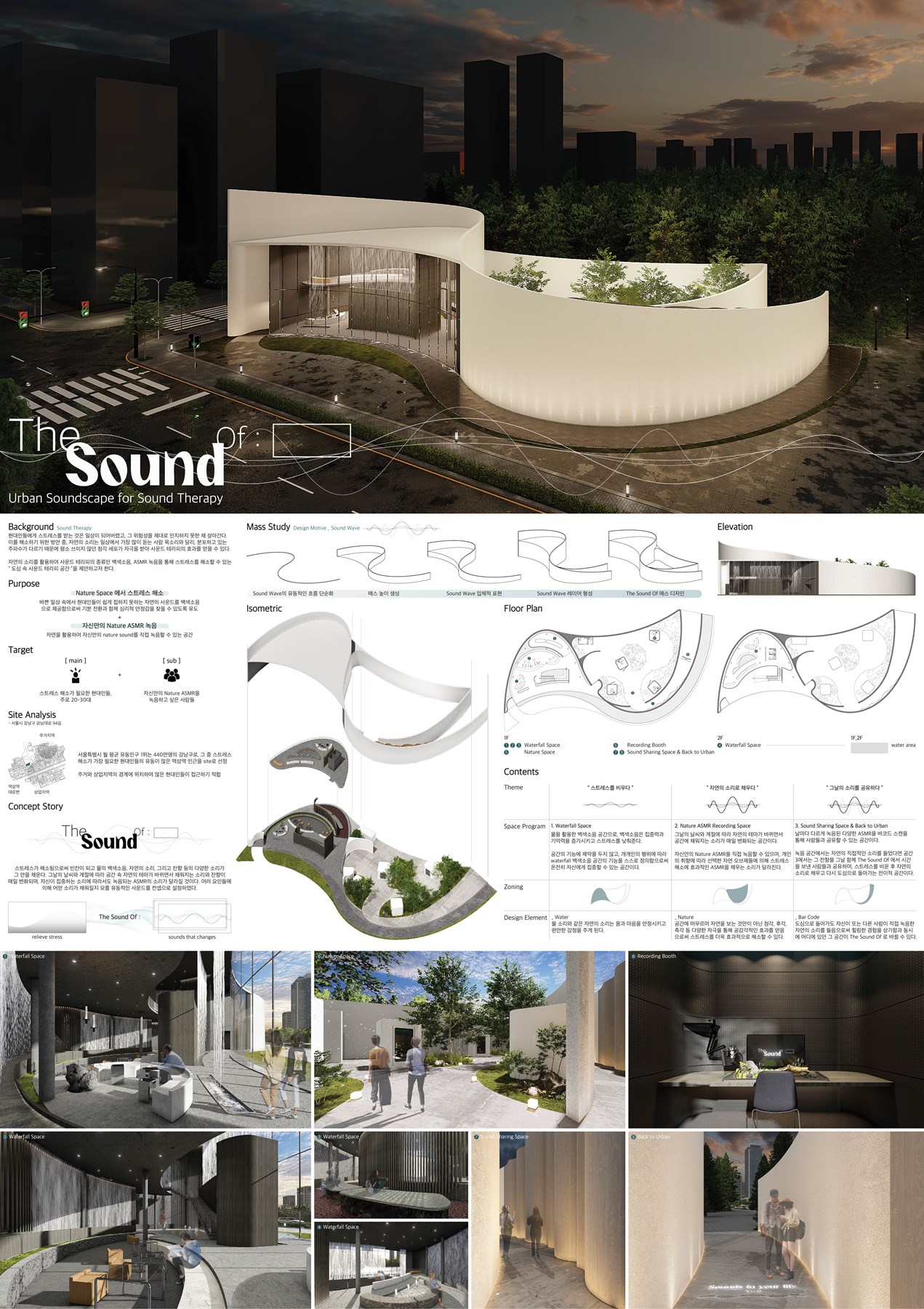 우수진 학생은 지친 현대인들의 휴식을 위한 공간으로서 사운드 테라피 공간을 제시하였습니다. 도심 내에서 직접 자연의 소리를 들고 즐길 수 있도록 위요된 공간 내에 물과 나무 등의 요소를 배치하였습니다. 건축물의 매스는 사운드의 파장을 활용하여 매우 미려한 형태로 도출하였으며, 또한 파장을 자연스럽게 활용하여 스트레스를 비워내고 – 자연의 소리를 채우고 – 그날의 소리를 공유하는 시퀀스를 구현하였습니다. 작은 규모의 단순한 공간이지만 실현하고자 하는 목적에 따른 공간을 감각적으로 도출하여 구현하였기에 우수진 학생의 작품을 추천 드리고자 합니다.
