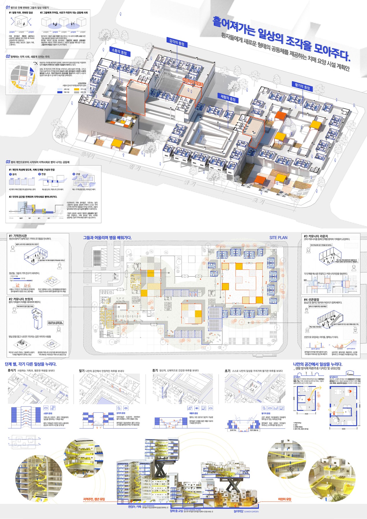 이는 공존의 공간을 만드는 것을 목적으로 두며, 이를 위해 치매환자의 행동패턴 분석을 통해 삶과 치유가 병행될 수 있는 flexible한 공간을 디자인 한 점이 인상적인 작품이다.