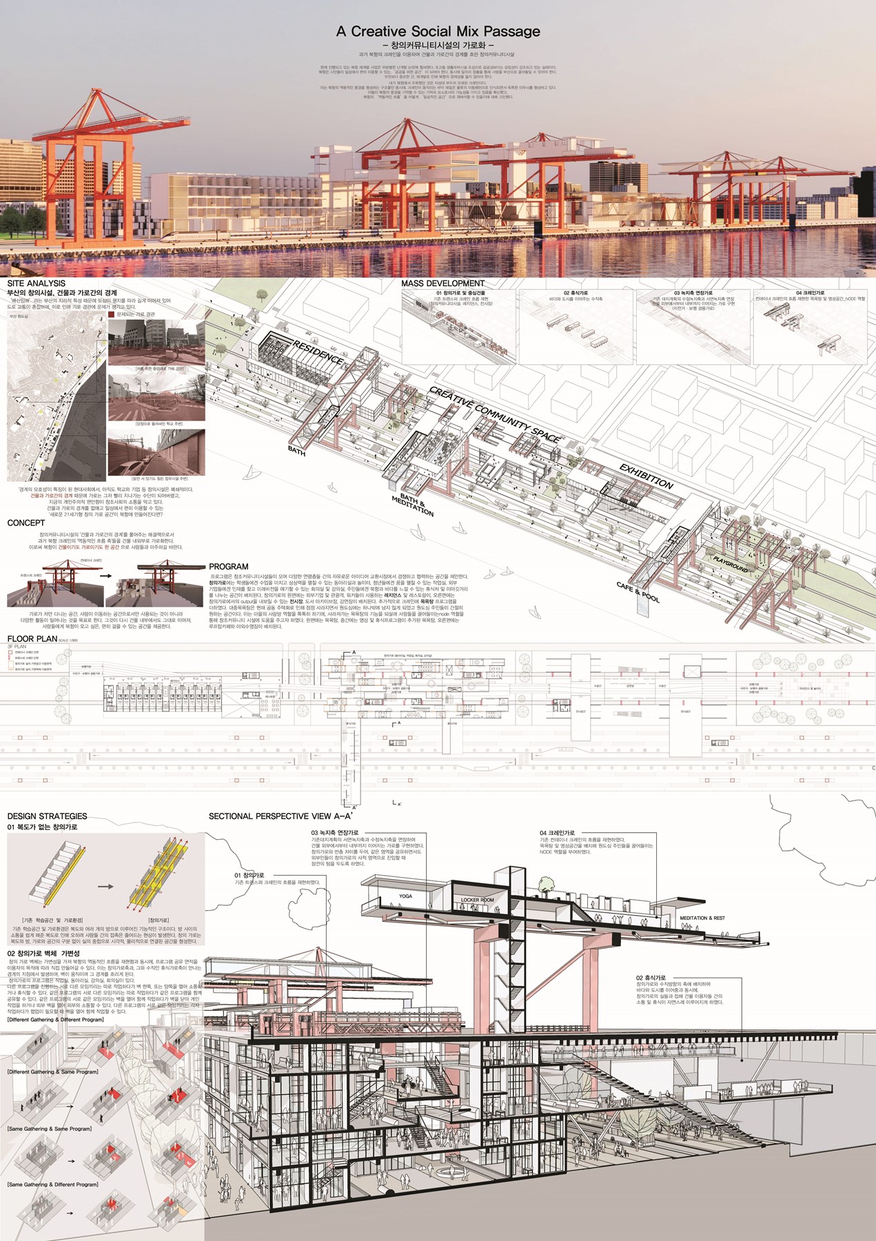 학생은 건물과 가로 간의 경계를 모호하게 만들어 다양한 활동이 가능한 ’창의커뮤니티시설의 가로화‘를 제안하였다. 북항의 크레인을 활용하여 역동적인 흐름의 축을 재정비하고, 4개의 큰 매스를 구성하여 창의가로, 휴식가로, 녹지축 연장가로, 크레인 가로를 계획하였다. 창의 가로의 가변적 작업공간, 원도심의 녹지축을 연장하고 다양한 스케일로 중첩되는 전시공간들과 크레인 가로의 다양한 목욕탕들은 물리적인 경계를 넘어 바다와 도시의 관계를 투영시키고, 이를 통해 창의성을 증진시키려는 학생의 노력이 잘 드러난다.