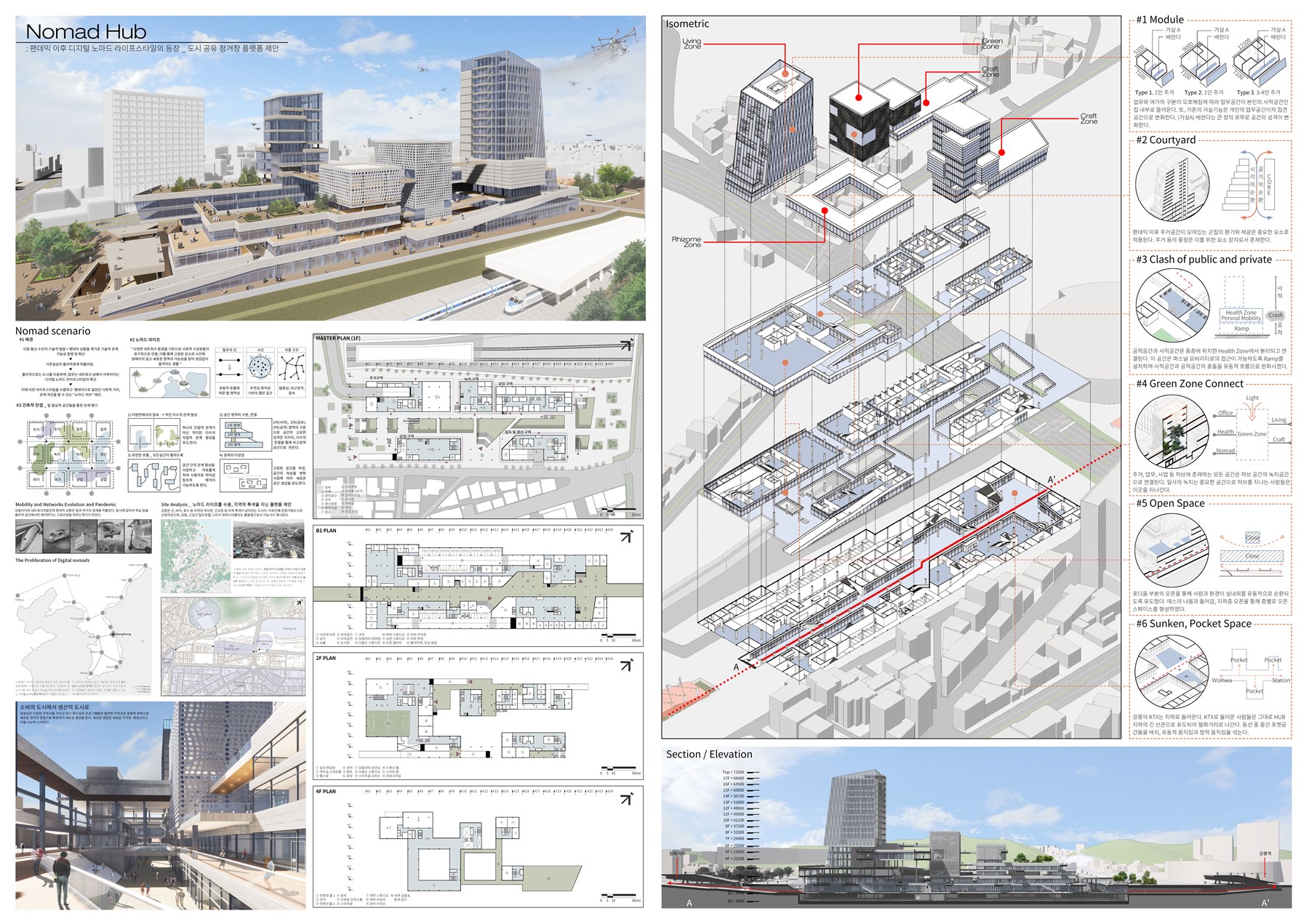 이 프로젝트는 팬데믹 이후 고정된 생활 범위가 아닌 유동적인 생활에 따른 공간을 제안했으며, 이를 '도시 공유 정거장, Nomad Hub' 라 표현하였다. 탈 중심의 성격을 가지는 다양한 공간, 환경을 제안하고 사용자로 하여금 다양한 행위를 유도하고자 했다. 이 공간들은 도넛 형태의 매스와 브릿지, 램프로 연결되며, 지하로 들어오는 KTX의 연장선으로서 Hub의 선큰과 연결되어 강릉의 구도심까지 이어진다. 결론적으로 위 프로젝트는 각각의 공간들을 하나의 유기체처럼 연결하여 생동감 있게 움직이는 HUB를 제안하였다.