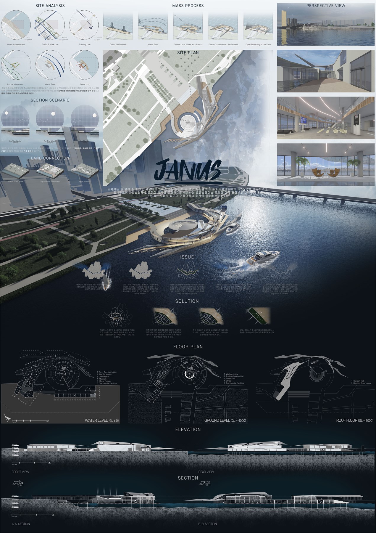 국제도시로서의 서울이 가지는 지정학적 위상과 한강이라는 환경적 특징을 연계하는 복합시설 제안으로서 본 작품이 가지는 특징은 육상과 해상을 잇는 연결 허브로서의 역할을 매우 유기적으로 풀어낸 부분에서 찾을 수 있다. 프로그램적으로는 훼리 터미널이라는 공공 교통시설이 한강 시민 공원을 직접적으로 이어주기 보다는 문화, 상업 시설들을 통한 우회 연결 방식을 통해 새롭고 다양한 감각적 체험의 루트을 제공하고 있으며 이러한 면밀한 접합의 구성 방식은 유동적 구조 시스템과 더불어 매우 역동적인 형태 조합을 통해 복합적인 공간 구성으로 귀결되도록 계획한 흔적을 드러낸다. 무엇보다도 다소 광역적 개념 설정이 가져다 주는 피상적인 계획의 한계에서 벗어나 도시 인프라 구조의 일부분으로서의 랜드마크가 실질적이고도 능동적으로 작동될 수 있도록 세밀하게 계획한 점에서 건축이 가져야 할 공공적 기능에 대한 책임과 역할을 이해하고 계획한 노력을 잘 보여준다.