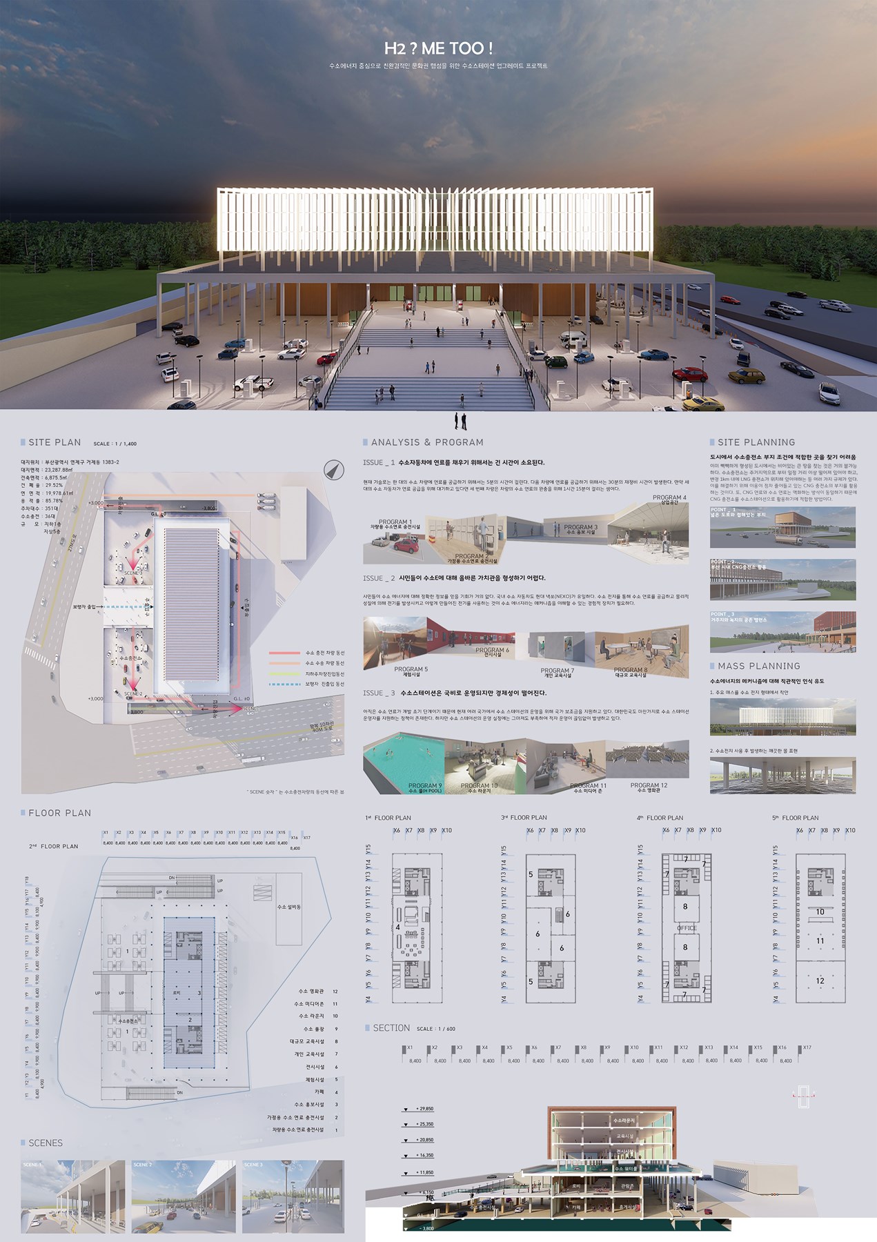 작품 ‘H2 ? ME TOO !’는 수소스테이션을 업그레이드하여 수소에너지를 중심으로 친환경적인 문화권 형성을 도모하기 위한 수소테마스테이션 프로젝트이다. 수소연료와 CNG 연료의 액화방식이 동일하다는 점에서 기존의 CNG충전소를 활용하여 CNG자동차와 수소자동차에 모두 대응 가능한 충전소를 계획했다. 충전시설 뿐만 아니라 전시동, 체험동, 교육동 등도 계획하여 충전소 이용자뿐만 아니라 수소연료에 대한 다양한 정보를 제공할 수 있는 공간도 마련하였다. 또한, 주요 매스의 형태는 수소 전지에서 착안하여 이용자가 직관적으로 매커니즘을 이해할 수 있도록 하였다.