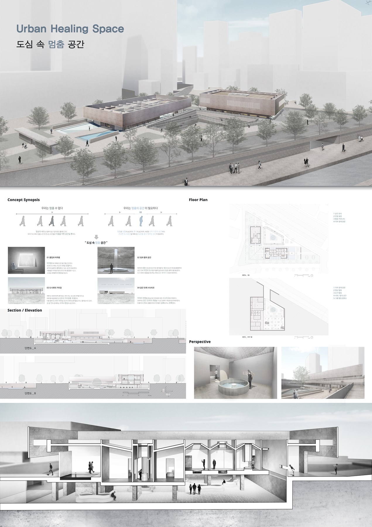 우리는 멈출 수 없다. 일상의 속도는 멈추지 않고 앞으로 흘러만 간다. 우리가 도시에서 집을 나선 뒤 만나는 공간들은 이동을 위한 공간일 뿐이다. 우리는 멈춤의 공간이 필요하다. 멈춤은 성찰의 순간이자, 휴식의 순간이며, 새로운 시작 이전의 순간이다. 건강한 도시공간을 위해서는 도시의 일상을 잠시 멈추는 공간이 필요하다. Querencia / Spielraum / Fast Healing 개념이 도입된 도심 속 머무름을 통해, 자신의 내면을 성찰하고 생각에 집중하여 몰입한다. 위계의 변화를 중심으로 멈춤에 대한 시나리오를 통해 공간의 흐름이 전개된다. 이용자의 선택과 경험에 따라 도시와의 거리감을 조절하며, 머무름이 심화되거나, 완화된다.