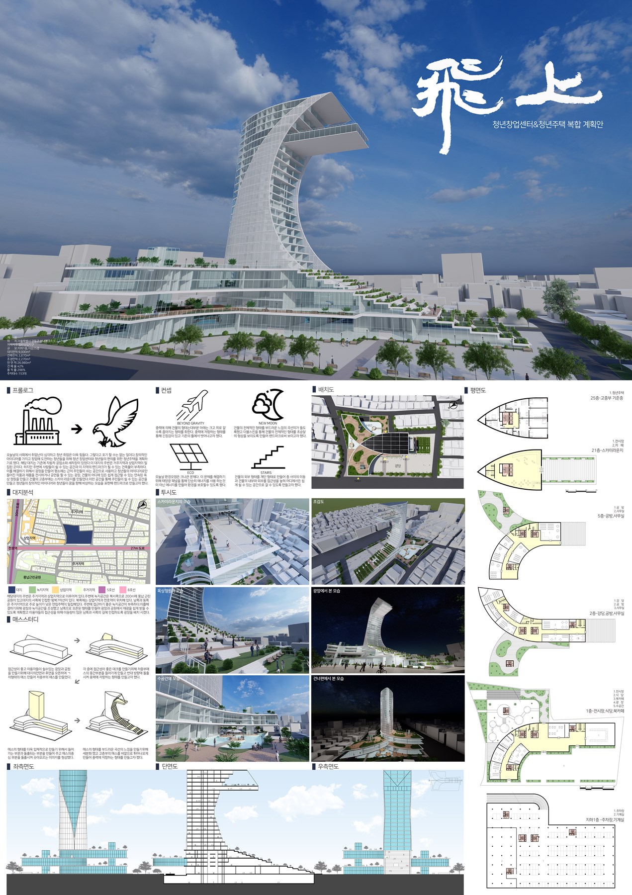오늘날의 사회에서 취업난이 심각하고 청년 취업은 더욱 힘들다. 그렇다고 포기 할 수는 없는 일이다.창의적인 아이디어를 가지고 창업에 도전하는 청년들을 위해 청년 창업 센터와 청년들의 편의를 위한 청년 주택을 계획하기로 했다. 해당 대지는 기존에 자동차 공업소와 세차장이 있었다.이 대지의 주변은 거주 지역과 상업 지역이 밀집된 곳이다. 하지만 주변에 사람들이 쉴 수 있는 공간과 이 지역의 랜드 마크가 될 수 있는 건축물이 부족하다. 이를 해결하기 위해서 광장을 만들어 평소에는 근처 주민들이 쉬는 공간으로 사용하고 청년들의 아이디어로 만들어진 작품과 제품을 전시하거나 공연을 할 수 있는 광장, 건물의 어디에 있든 쉽게 접근할 수 있는 연속된 옥상 정원을 만들고 건물의 고층부에는 스카이 라운지를 만들었다.이런 공간을 통해 주민들이 쉴 수 있는 공간을 만들고 청년들의 창의적인 아이디어와 청년들이 꿈을 향해 비상하는 모습을 표현해 랜드 마크로 만들고자 했다.