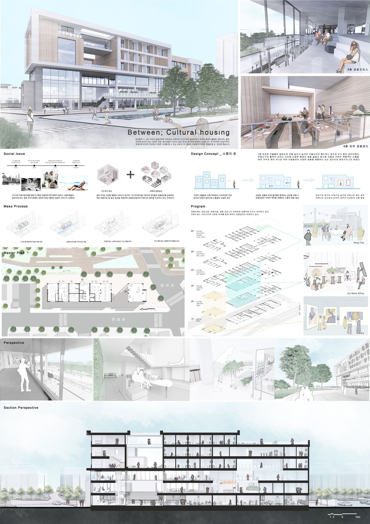 이 작품은 ‘공유’의 관점에서 도시주거 커뮤니티 만들기 주제로, 대지 주변의 경의선 숲길과 연결되는 1, 2인 가구 중심의 공유 주거단지를 계획하는 프로젝트이다.