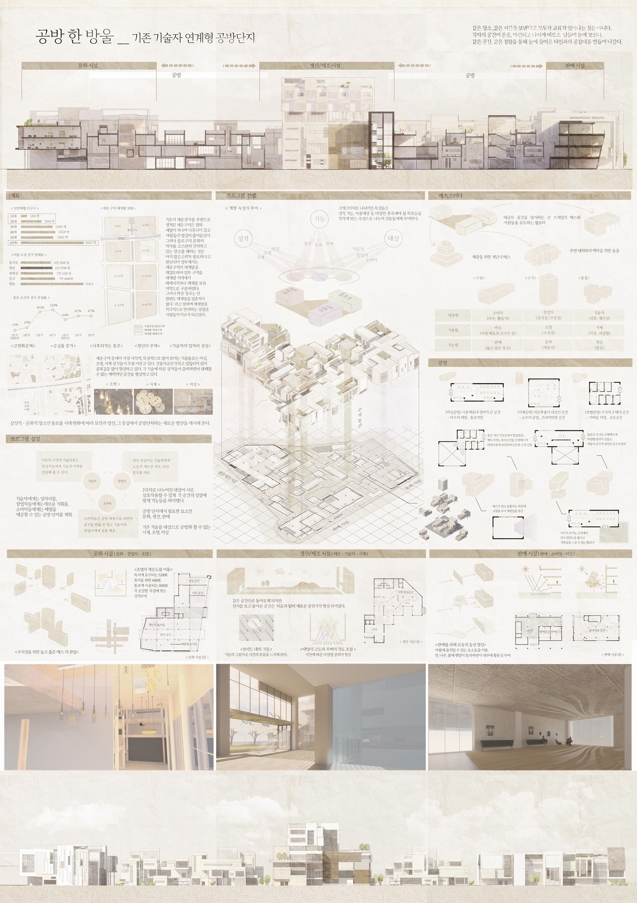 작품설명 기존의 각종 기술상가(조명 시계 미싱 전기 기계)들이 가지는 매력적인 분위기를 그대로 유지하면서 현재, 시대의 흐름에 따른 계획안으로 역사와 상징이 있는 거리를 다시금 재조명 받을 수 있게 유도한다. 1. 기술자, 창업자, 소비자들이 활동 할 수 있는 공간을 형성한다. - 기존의 기술자들에게는 일거리를, 새로운 창업자에게는 기술력을, 소비자에게는 체험공간을 제공하는 공방을 계획 2. 공방에 필요한 생산, 제조, 판매가 모두 가능한 공간 형성 - 서로 다른 성격을 요구하는 매스들을 분리하고 각각의 공간들을 형성 - 3가지의 공간이 각각 기술자, 창업자, 소비자들의 공간으로 탄생 - 각 공간을 이어주는 매개체로서의 다수의 소규모 공방매스 3. 서로 다른 공간이 부딪히면서 생기는 다양한 교집합 공간에서 경험 유도 - 세대간 차이, 기능별 차이, 성격별 차이가 존재하게 되고 이를 묶어주는 컨셉 적용 - 각 공간이 얽혀가며 생기는 상호작용으로 새로운 공간 형성 - 화합을 위한 경험 생성 서로 반대되는 성격의 사람들을 하나에 공간에 모은다고 해서 교류가 일어나는 것은 아니다. 같은 공간에서 같은 경험을 통해 작게나마 공감대가 형성이 된다. 서로 다른 두 가지 색에 한 방울의 색을 떨어뜨리면 각자의 색이 옅어지며 하나의 색이 되어가듯, 조금일지라도 서로 다른 성격 사이에 공방이라는 공감 한 방울을 떨어뜨려보고자 한다.