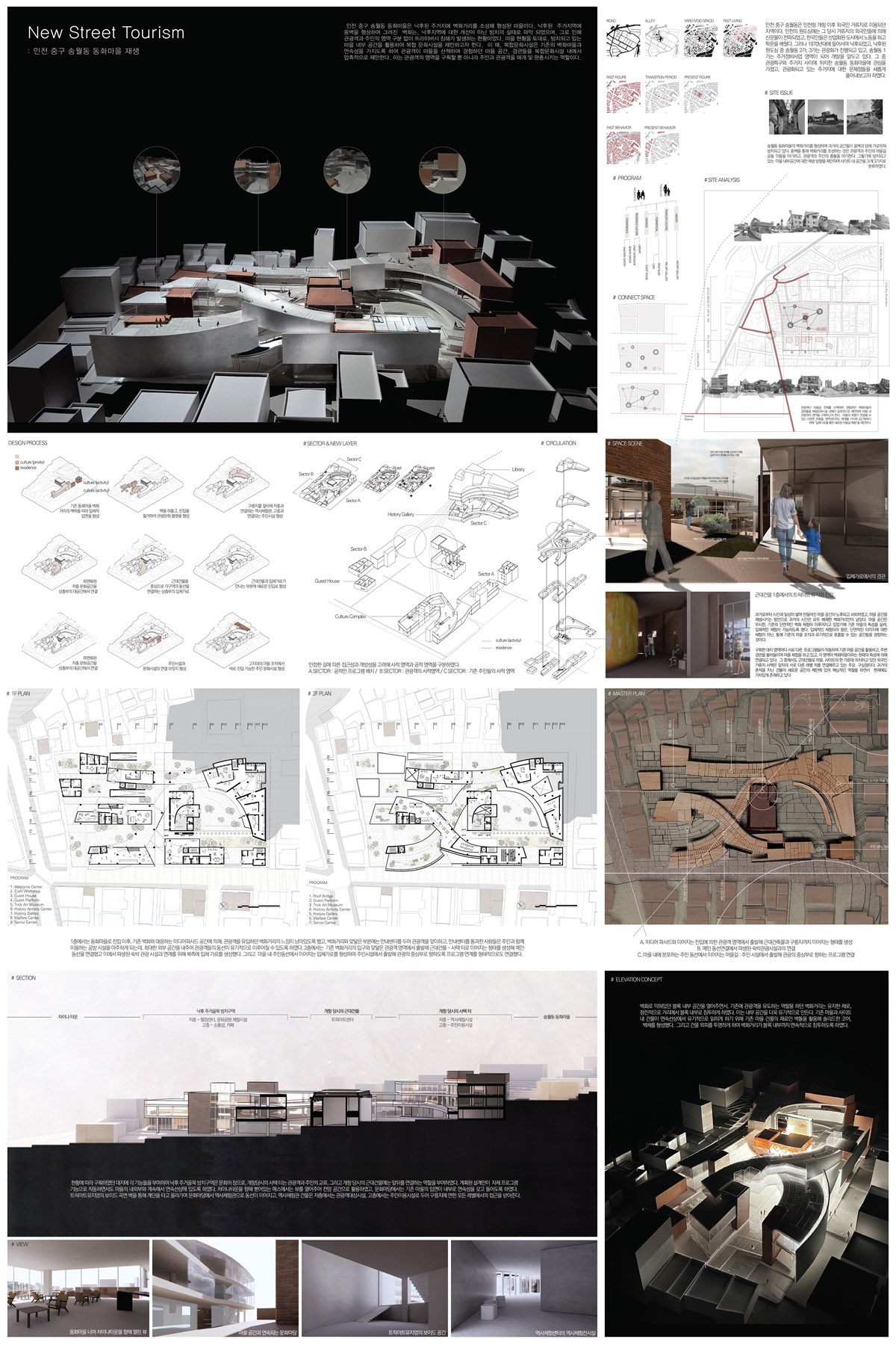 설계대지인 인천 중구 송월동 동화마을은 벽화거리를 조성해 형성된 마을인데, 낙후된 주거지에 옹벽을 형성하여 그려진 벽화는 방치되고 있어서 마을 내부 공간에 대한 방향성을 제안하며 대지 내 공간을 낙후 주거골목 방치구역, 개항당시의 근대 건물, 개항 당시의 사택 터로 분류하였다. 그리고, 마을의 흐름이 연결될 수 있는 다양한 흐름을 영역성이라는 체계를 가지며 공간화하기 위해 ‘입체가로를 통한 새로운 마을길 체험’을 제안하여, 기존 마을길 및 관광객의 입체가로를 레벨별로 계획하고 새로운 프로그램의 제안과 기존 마을 건물의 재료인 벽돌을 활용하였다. 이 작품은 기존 낙후된 마을의 특성을 역사 사회 건축적으로 잘 분석하여, 방치되고 있는 마을 내부 공간을 활용하여 다양한 도시의 관점에서 복합 문화시설을 제안한 것이 우수하여 추천하고자 한다.