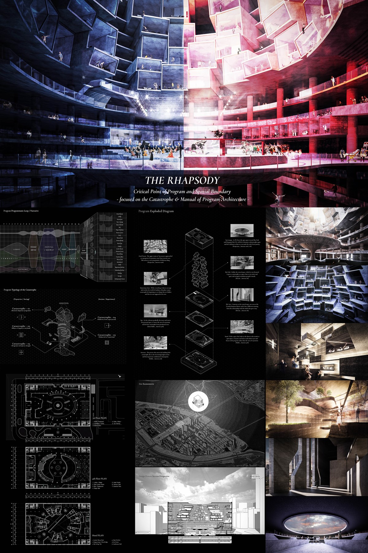 또한 중앙스테이지를 중심으로 둘러싼 여러 공간들이 서로 각기 다른 관계성을 맺고 있다. 또한 그 각각의 관계성 속에서 건물에서 느낄 수 있는 Catastrophe의 Typology는 크게 세가지로 나눌 수 있다. (1)이질적인 프로그램에 의해서 발생하는 카타스트로피 (2) 공간은 그대로이지만 주변의 프로그램의 전환에 의해서 발생하는 역전적 카타스트로피 (3)공간과 프로그램 모두의 전환에서 발생되는 카타스트로피로 분류될 수 있으며 각기 다른 서로의 체험들은 Catharsis를 향한 Narrative로서 작용하여 하나의 RHAPSODY를 이룬다.