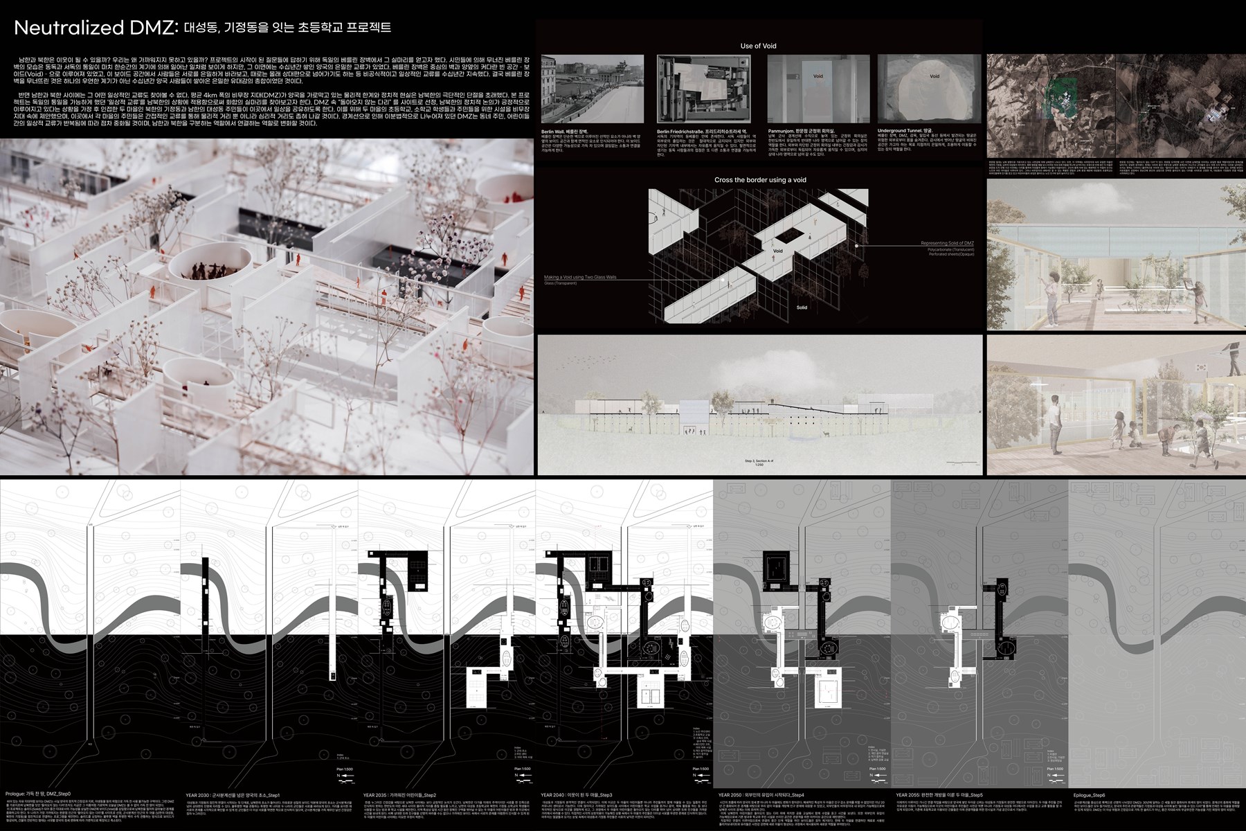 이러한 예외적 상황은 보이드 공간이 다양한 가능성과 행위들을 수용할 수 있었기에 가능했다. 따라서 보이드와 솔리드 개념을 적용해 긴장감으로 가득찬 DMZ 내에 보이드를 삽입했고, 그 안에서만큼은 양국 사람들이 자유롭게 움직이며 경계선을 넘나들 수 있도록 했다.