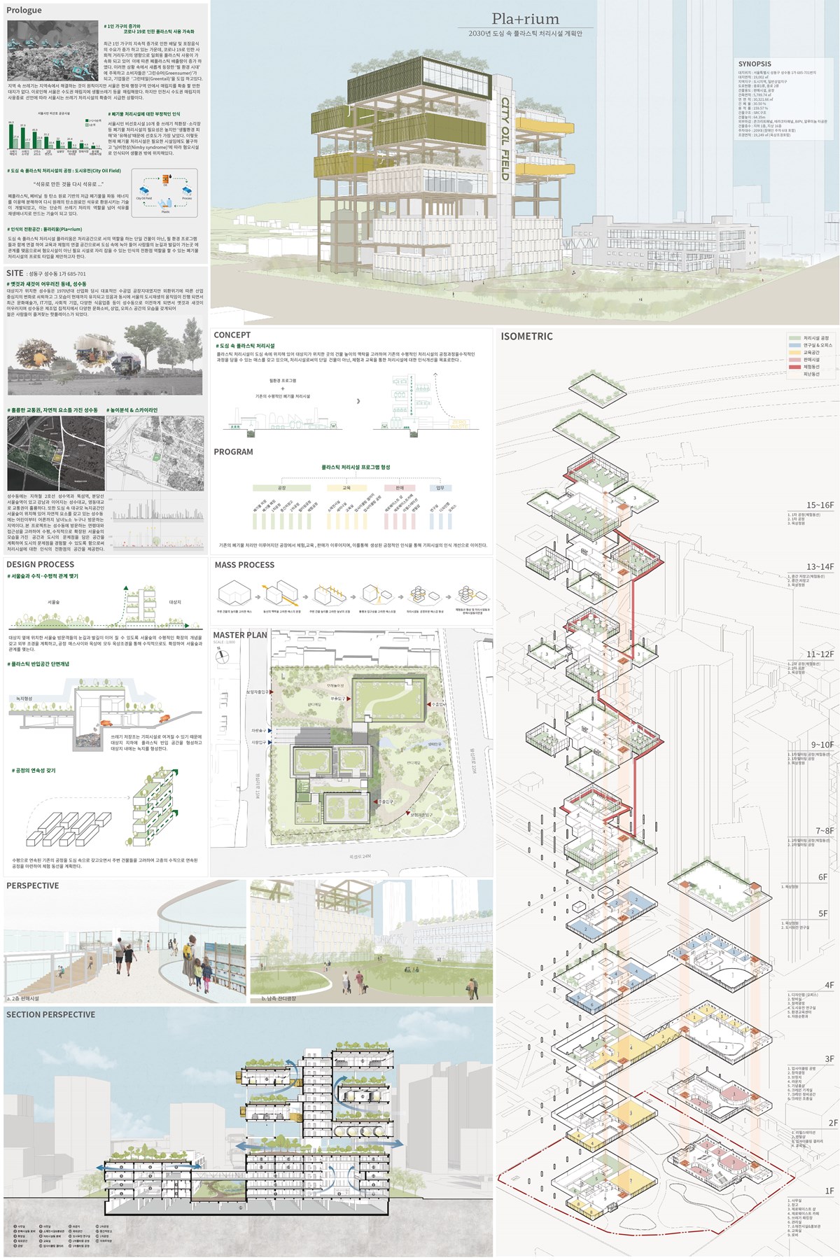 작품설명 최근 1인 가구의 지속적 증가와 코로나19로 인한 사회적 거리두기의 영향으로 일회용 플라스틱 사용이 가속화 되고 있고, 이에 따른 폐플라스틱 배출량이 증가하였다. 하지만 서울시에서 배출된 폐기물을 처리하는 수도권 매립지가 포화상태이며 처리시설이 혐오시설로 인식되고 있어 도심 속에는 처리시설이 설 공간이 없다. 본 설계안의 대상지에는 다양한 연령대의 사람들이 방문하는 서울숲 인근을 대상지로 선정하여 발길과 눈길이 닿는 곳에 처리시설을 계획하여 교육 및 체험을 통해 폐기물 처리시설이 혐오시설이 아닌 필요시설로 자리 잡을 수 있는 인식의 전환점 역할을 할 것이다.