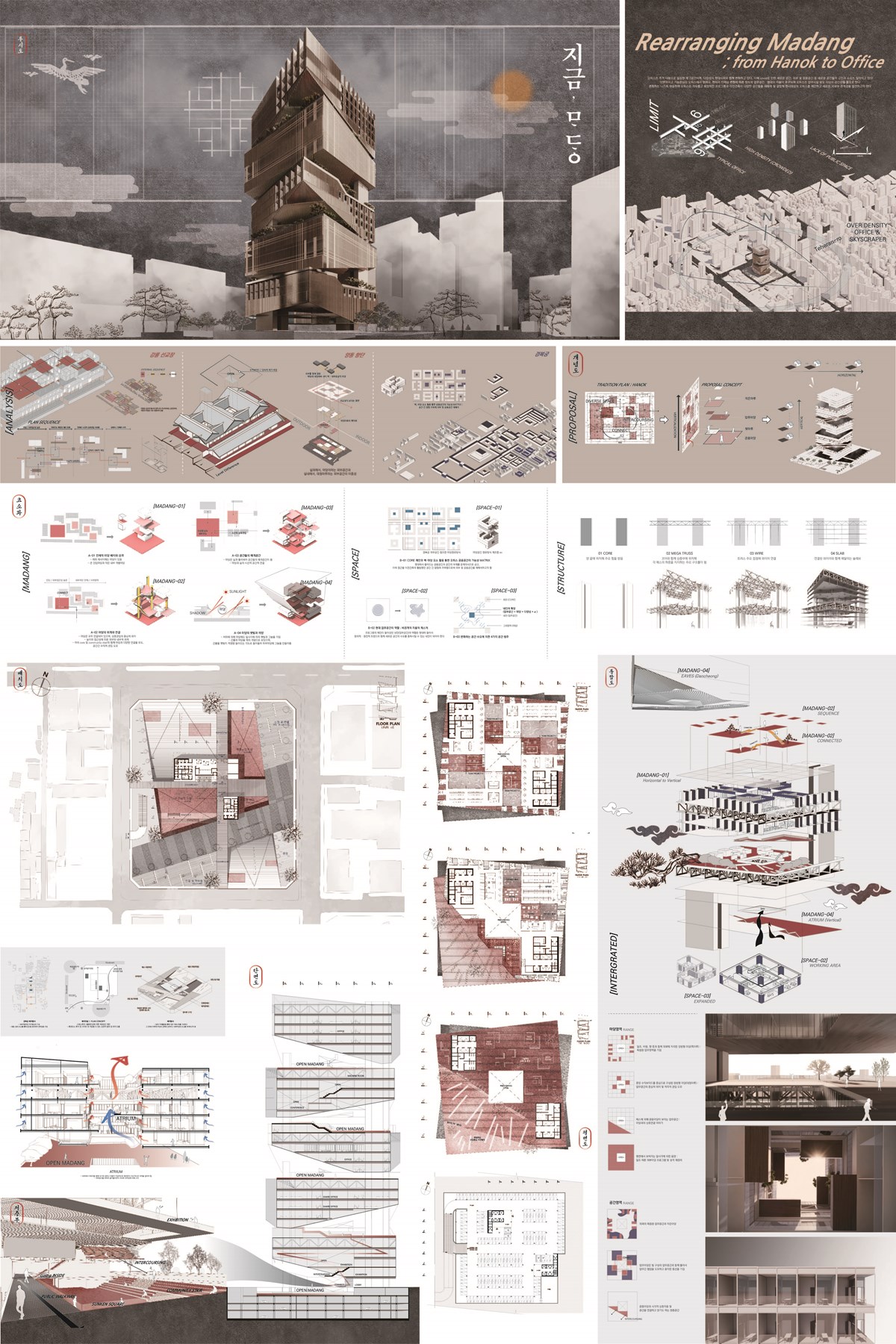 특히, 진화의 방향에 대한 해답을 서양 건축물에서 찾기보다 한국 전통건축물의 구성원리에서 찾고자 한 점이 신선하다. 전통건축물을 구성하고 있는 다양한 수평적 마당을 고층화, 재배열을 통해 ‘마당’을 현대적으로 해석하고 새로운 관계를 부여하였다. 결과적으로 전형적인 업무공간에 비하여 개선된 내외부의 관계, 창의성 증진을 위한 공용공간의 제공 등 다양한 장점을 갖는 새로운 건축 유형을 제안하고 있다.