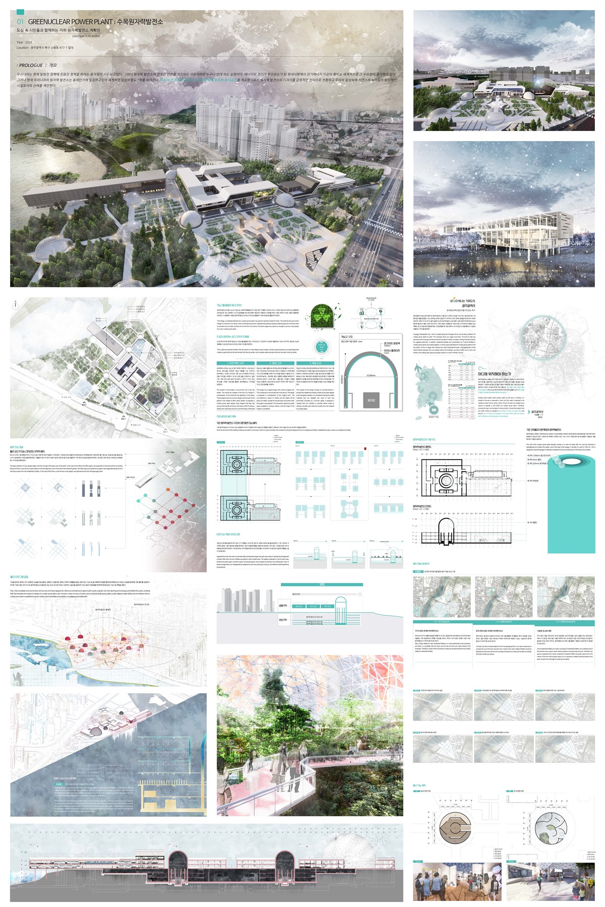 오늘날 도시와 건축에 숨겨진 가치를 탐구하고, 그 이상을 표현하는 ‘일상이상 이상일상’을 주제로 한 졸업 작품전에서 ‘수목원자력발전소’는 에너지 위기시대에 불가피하게 받아들일 수도 있는 원자력 발전소를 테마로 진행되었다. 기존의 원자력 발전소가 혐오시설로 교외로 형성되는 점과 달리 적극적으로 도심으로 끌어들이겠다란 개념으로 그 실현 가능성에 대한 논리와 제안으로 프로젝트는 신선함을 보여준다. 부지는 원자력 발전소 운용에 필요하는 물 공급이 가능한 영산강이 위치한 광주 도심이며 발전소의 기능적 시설은 지하에 매립하고 대지는 공원화한다. 원자력 발전소의 유형적 형태로 대변되는 돔형의 격납고는 지상으로 돌출시켜 제안된 문화시설 Folly 형태 및 식물원의 돔 계획에 논리성을 부가한다. 발전소에 작동방식에서 생산된 온배수는 양식장이라는 프로그램을 삽입하여 활용가능하게 하고 수산물 식당을 계획하여 프로그램적 연계성을 구축한다. 산업시설로 각인된 발전소에 대한 포용력과 건축적 가치로 구현하려는 노력은 오늘날 도시가 함께 고민하고 노력해야할 이슈를 제안함에 그 의미가 있다.